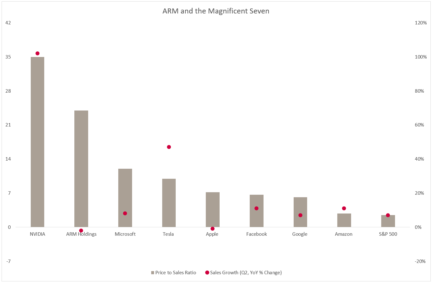 This rally could be explained (but not justified) due to the small float of the stock and many participants’ eagerness to get a piece of the pie. But looking at today’s COTD, which shows ARM, the Magnificant Seven, and the S&P 500, we note a very high valuation (Price/Sales - grey bars) and relatively mediocre growth (Revenue Growth - red dots) for ARM in comparison: