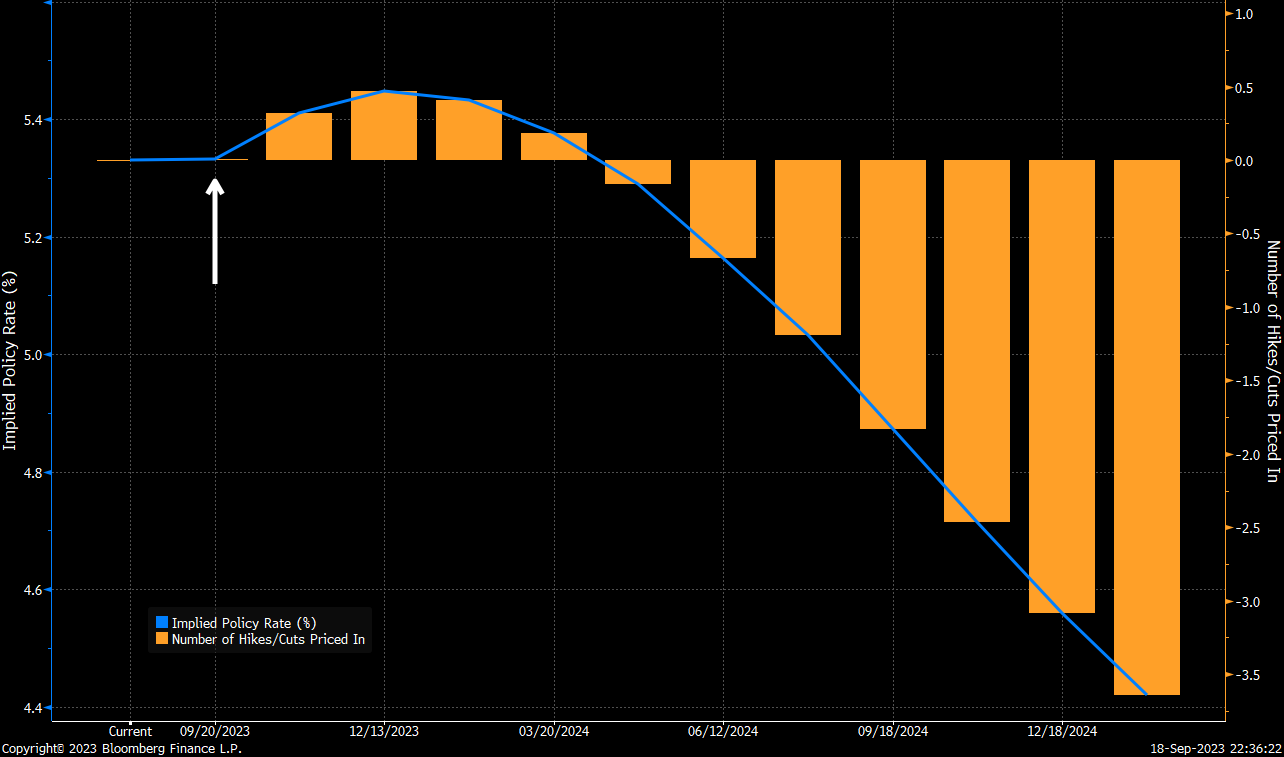 As mentioned, it is FOMC week and the Fed's decision not to move key policy rates is due on Wednesday afternoon. Here is the implied probability for a hike this week, deduced via Fed Fund Futures: