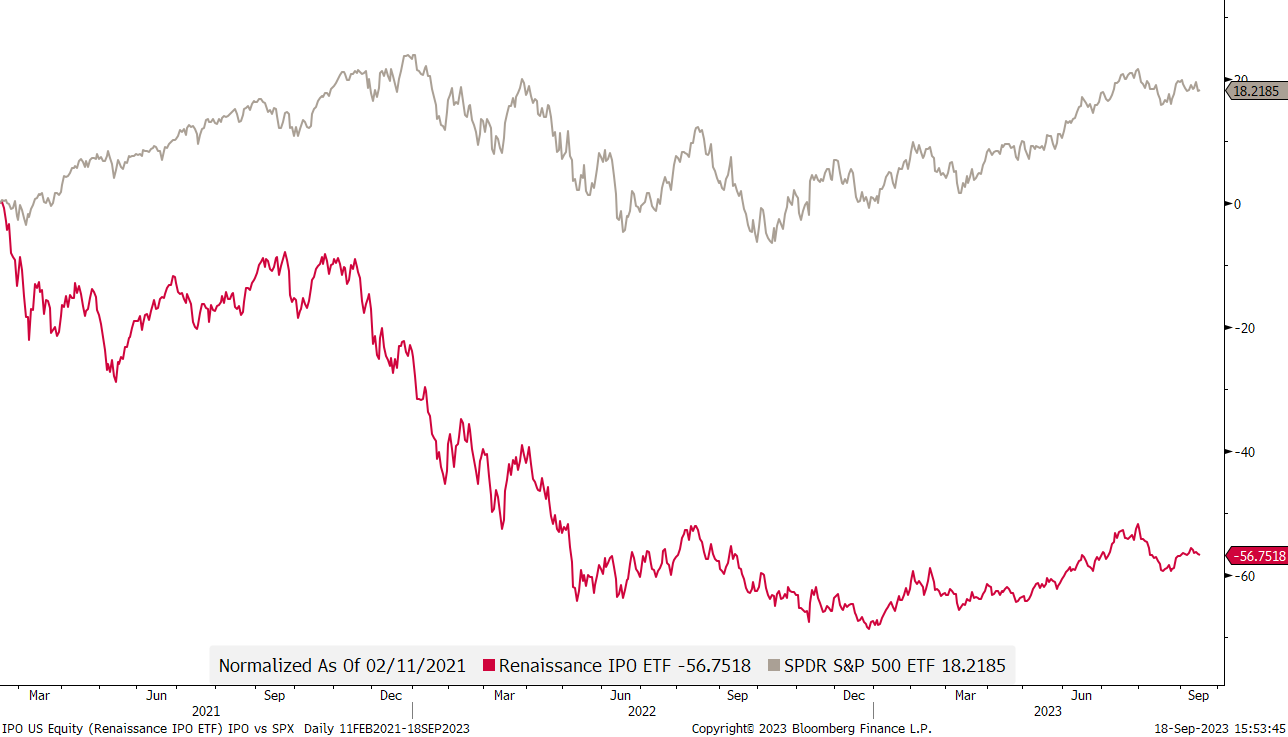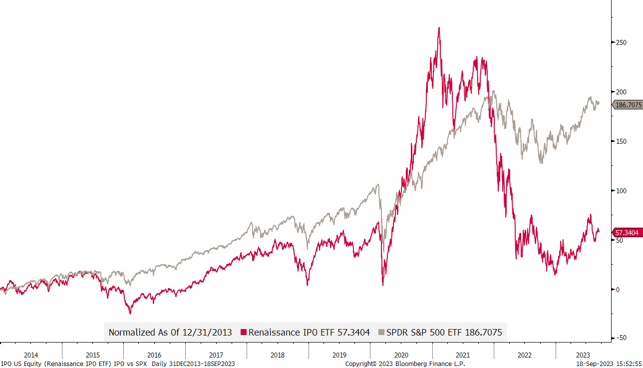 The red line is the Renaissance IPO ETF which does what is written on the tin and the grey line is the SPDR S&P 500 ETF (aka Spider). Not a great track record… Of course, I have slightly dramatized the picture by carefully choosing the time period under observation, but even zooming out to the whole history of data available, there is little in favour of being an IPO investor: