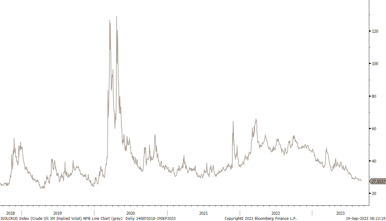 At the same time that oil is creeping higher, oil volatility is actually receding, which is a good prerequisite for higher prices yet: