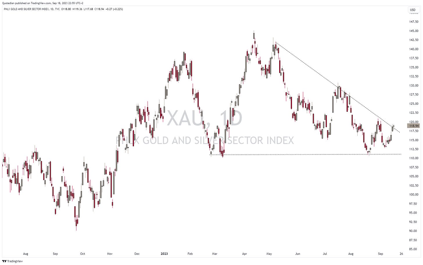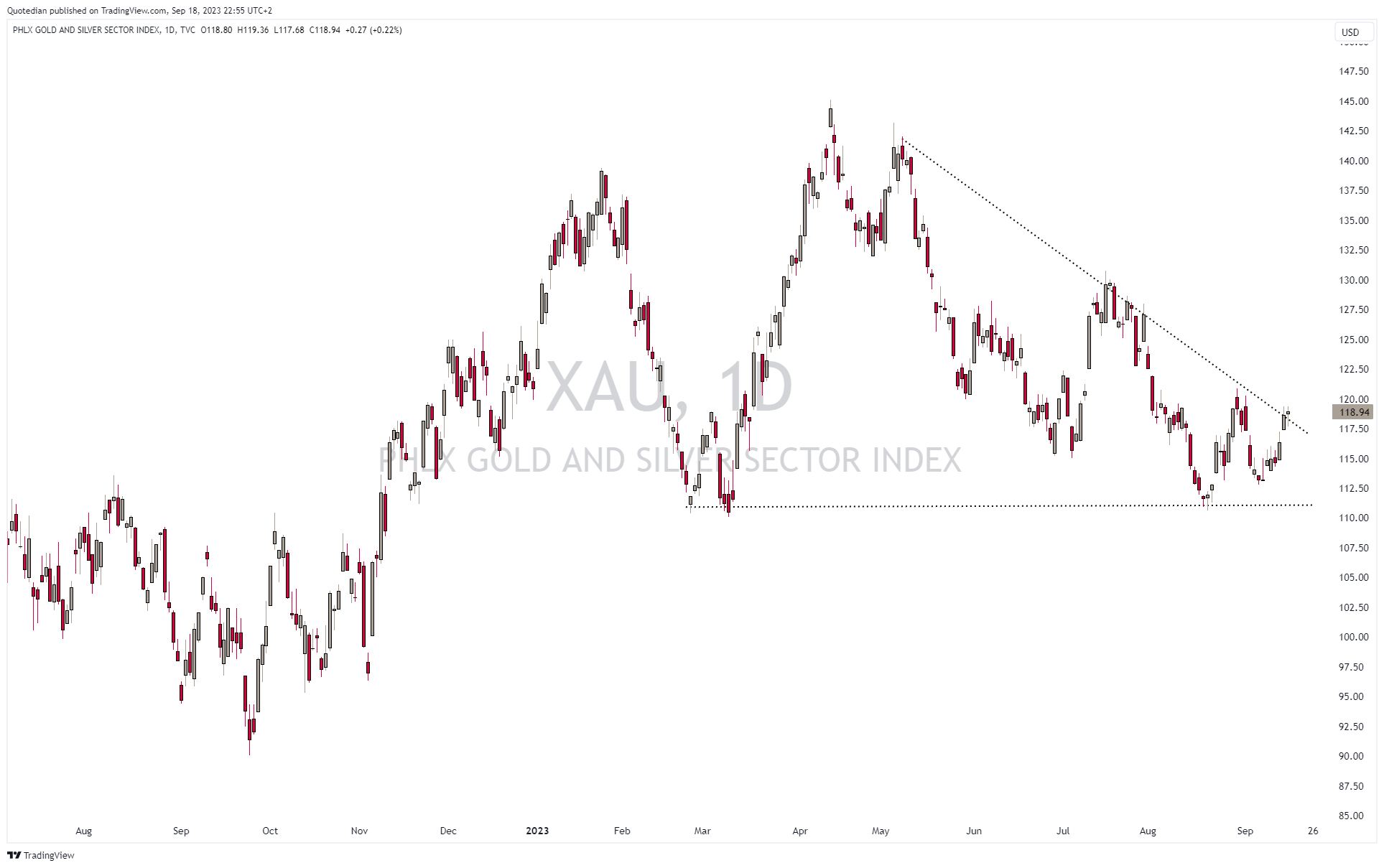 Maybe the time has come to play gold and silver mining stocks again. Here’s the chart of the PHLX Gold and Silver Index (XAU):