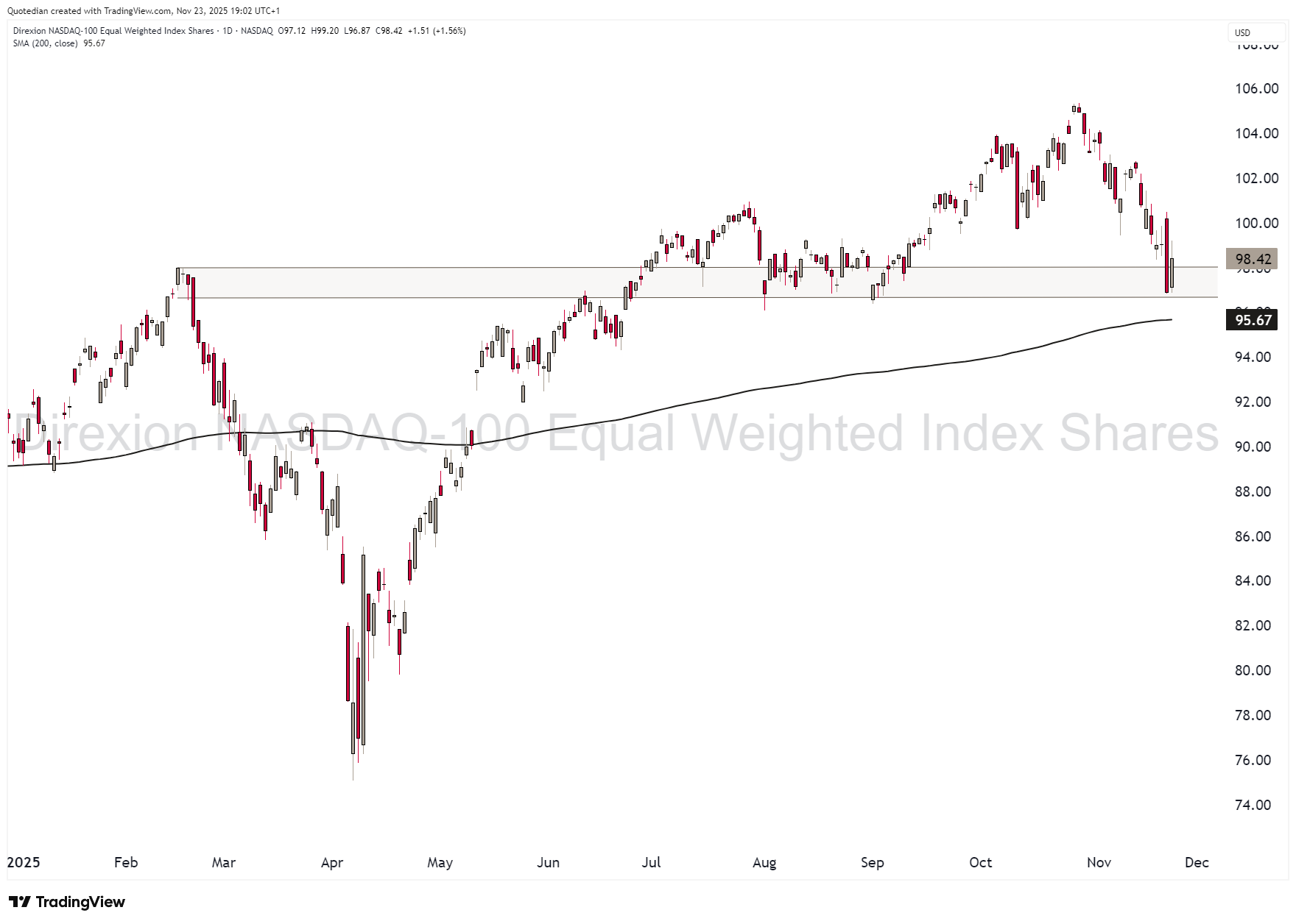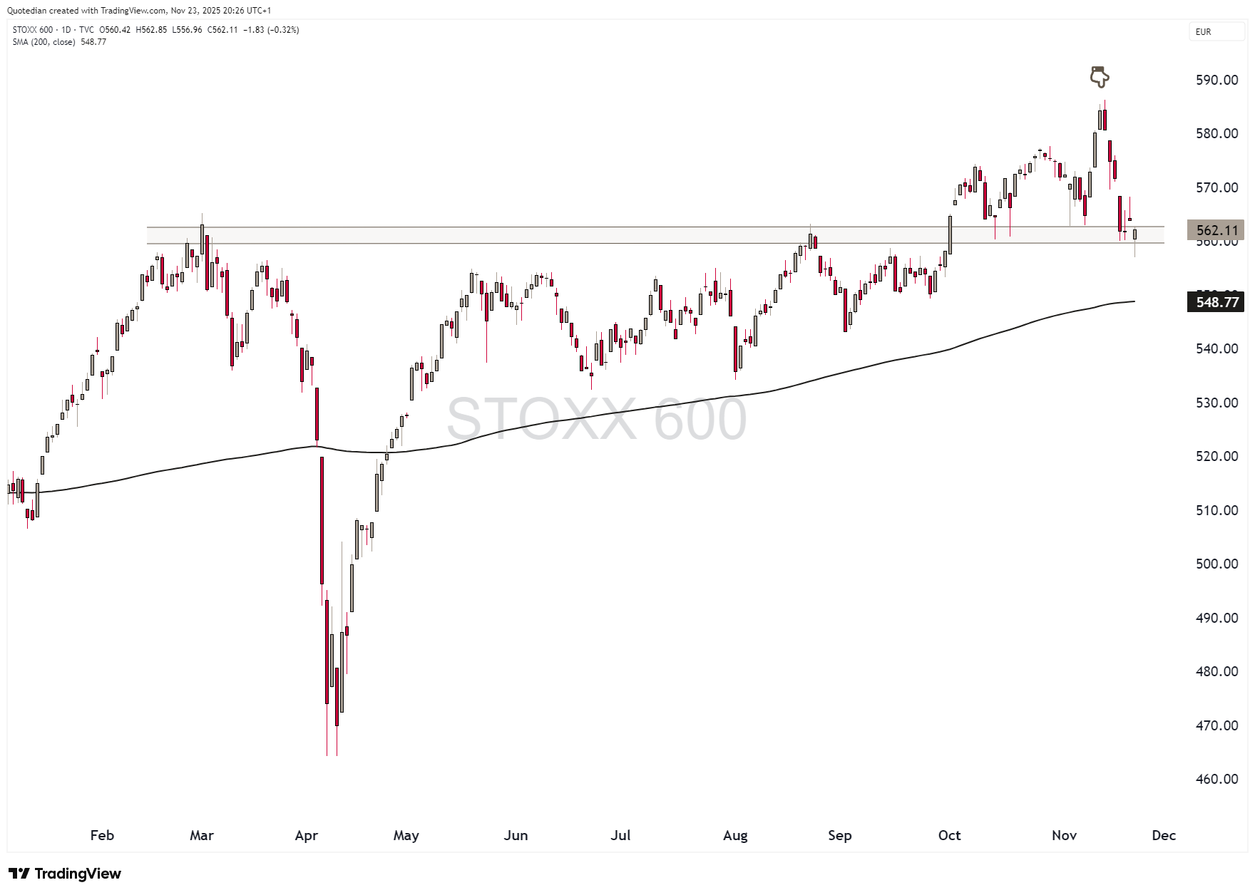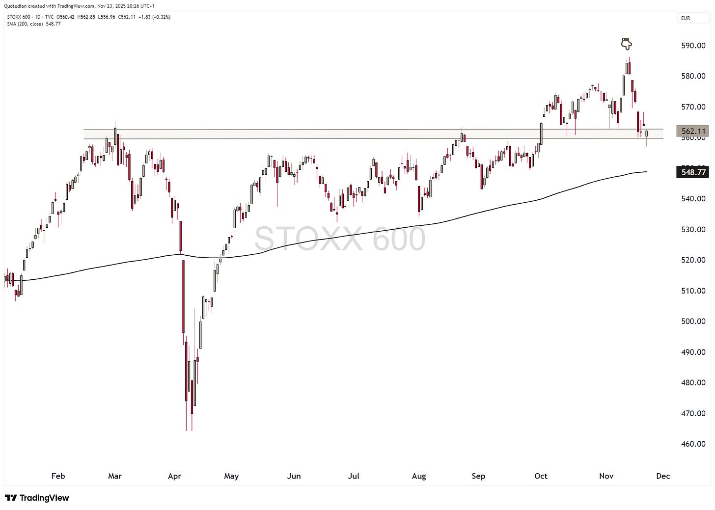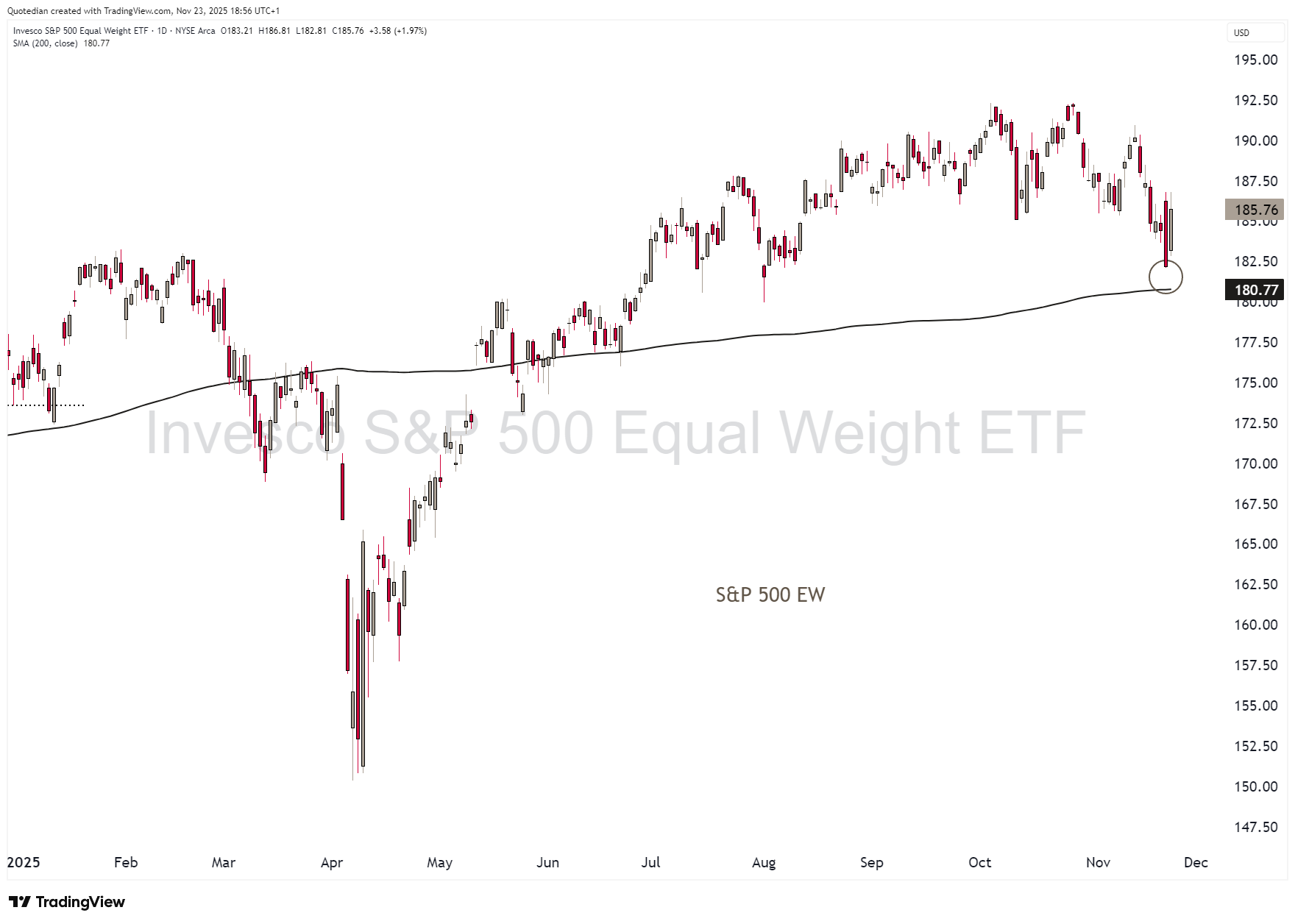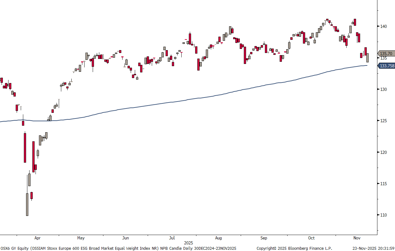 And, again, similar to its US cousins, the equal-weight version of the STOXX 600 has already reached the support zone from the 200-day moving average — and rebounded from there: