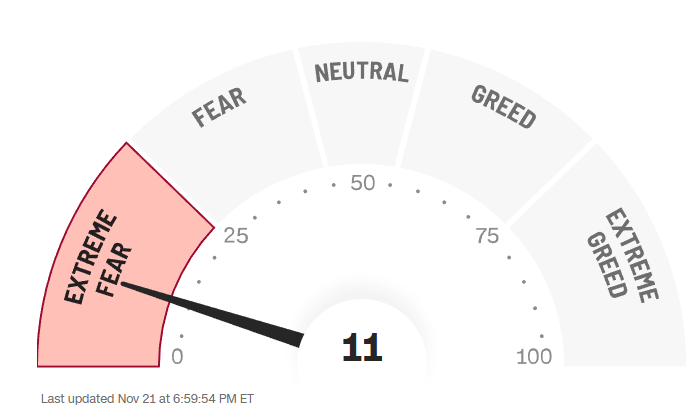 From a sentiment point of view, at least CNN’s Greed and Fear index is at extreme negative levels: