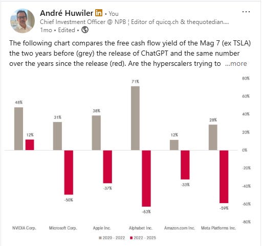 Secondly, investors have been starting to deliberate if all that AI-spending of the hyperscalers is actually really a good thing. I had posted about that capex-trouble a few weeks ago on LinkedIn: