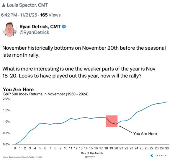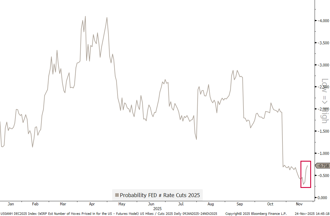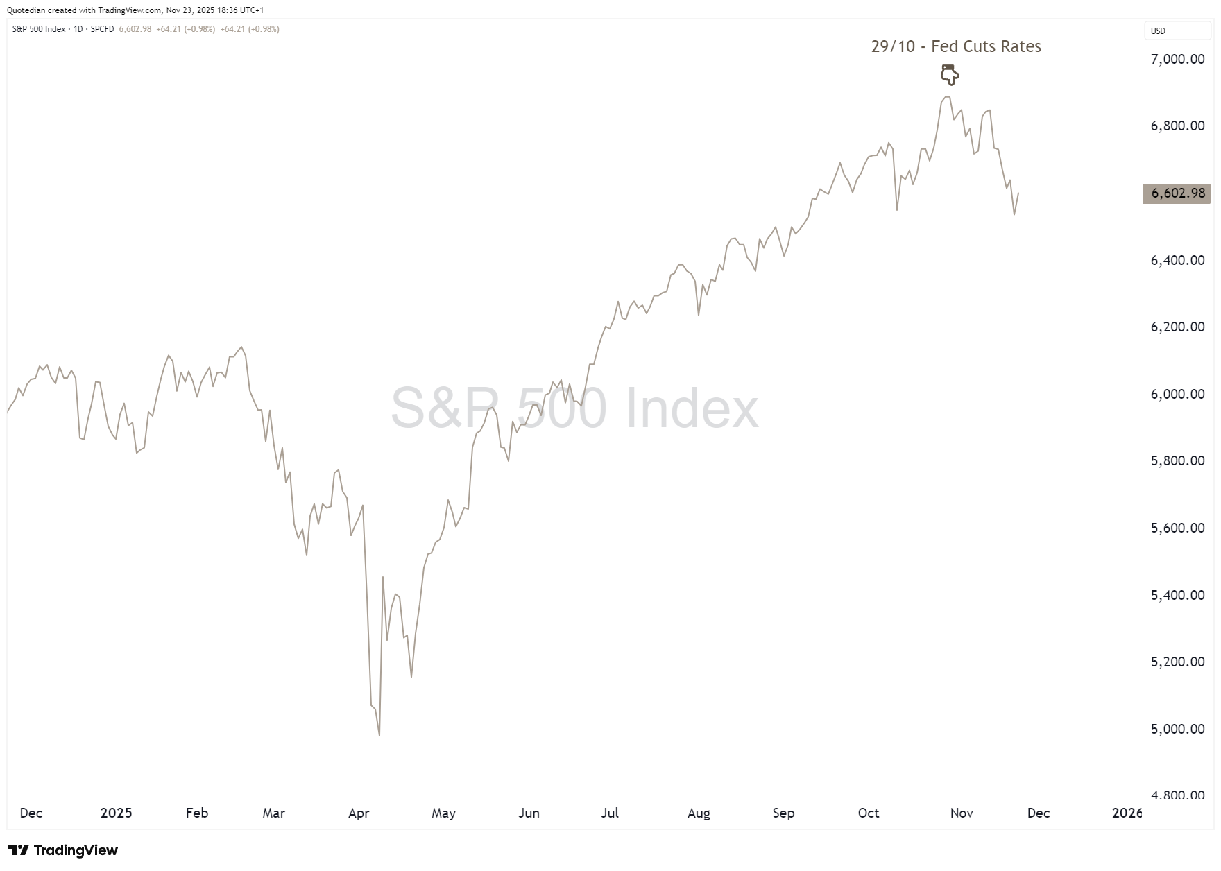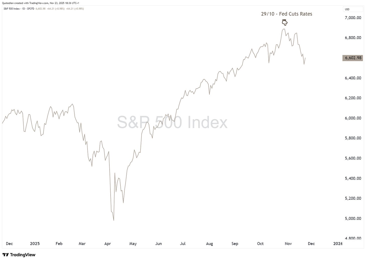 Well, first, that October FOMC cut was a hawkish cut, i.e. accompanied by not so market-friendly comments by Fed Boss Powell. More specifically, he mentioned that a December cut was “not a foregone conclusion”. This alone was enough to put equity investors’ into our sour mood.