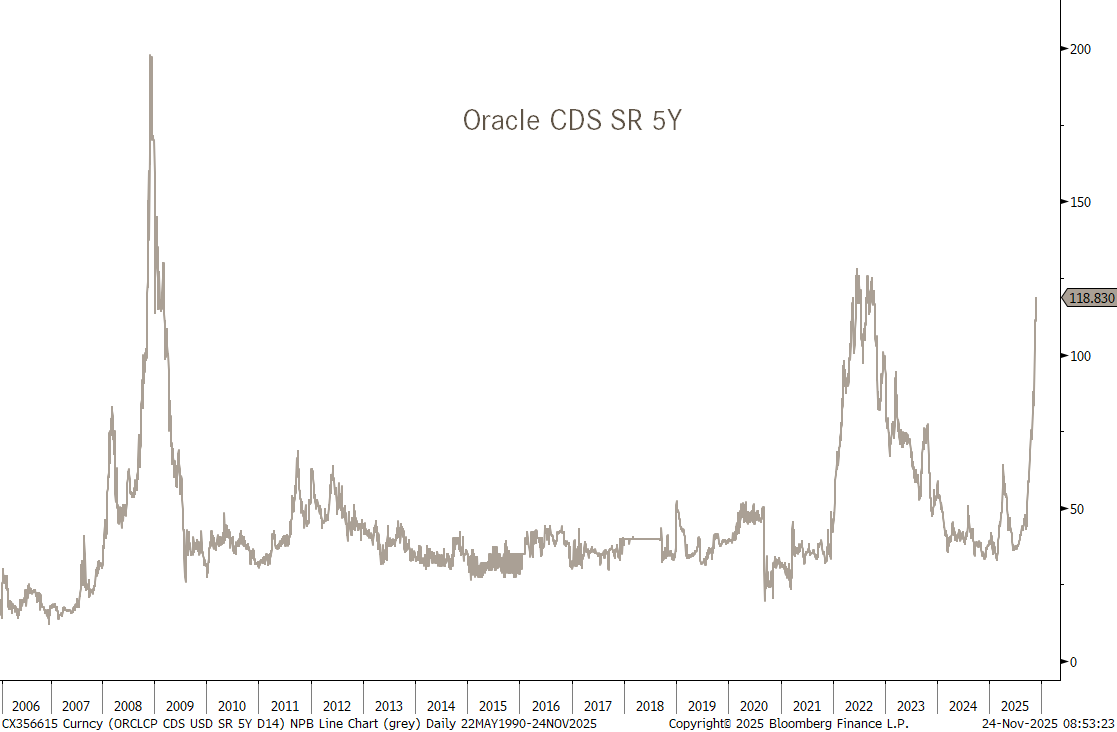 As mentioned, the focus was somewhat more on credit side, with especially this chart on CDS (Credit Default Swaps) pricing on Oracle making the rounds: