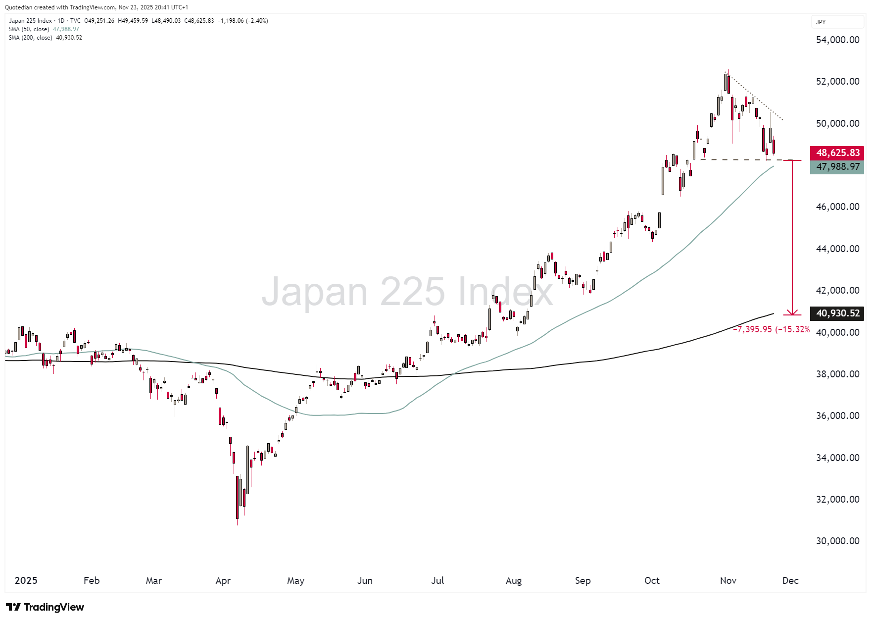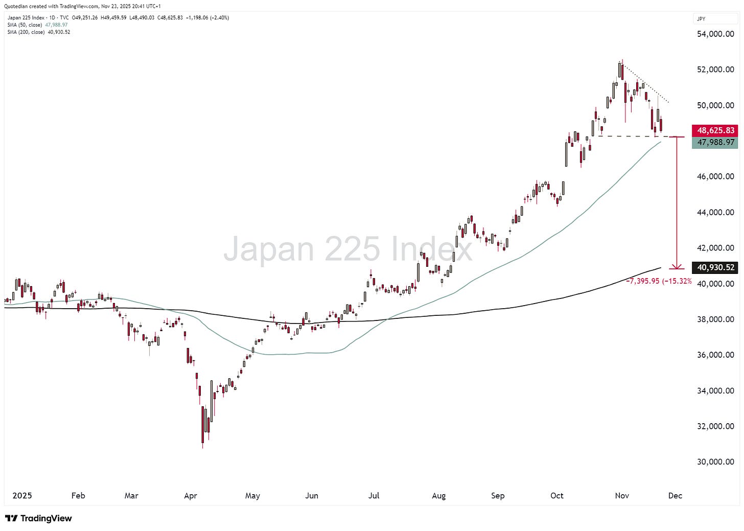 In the FAR East, Japan’s Nikkei-225 the is holding above the 50-day moving average despite a nearly 8% drawdown from all-time highs, but a break down here would mean a FAR way down ahead: