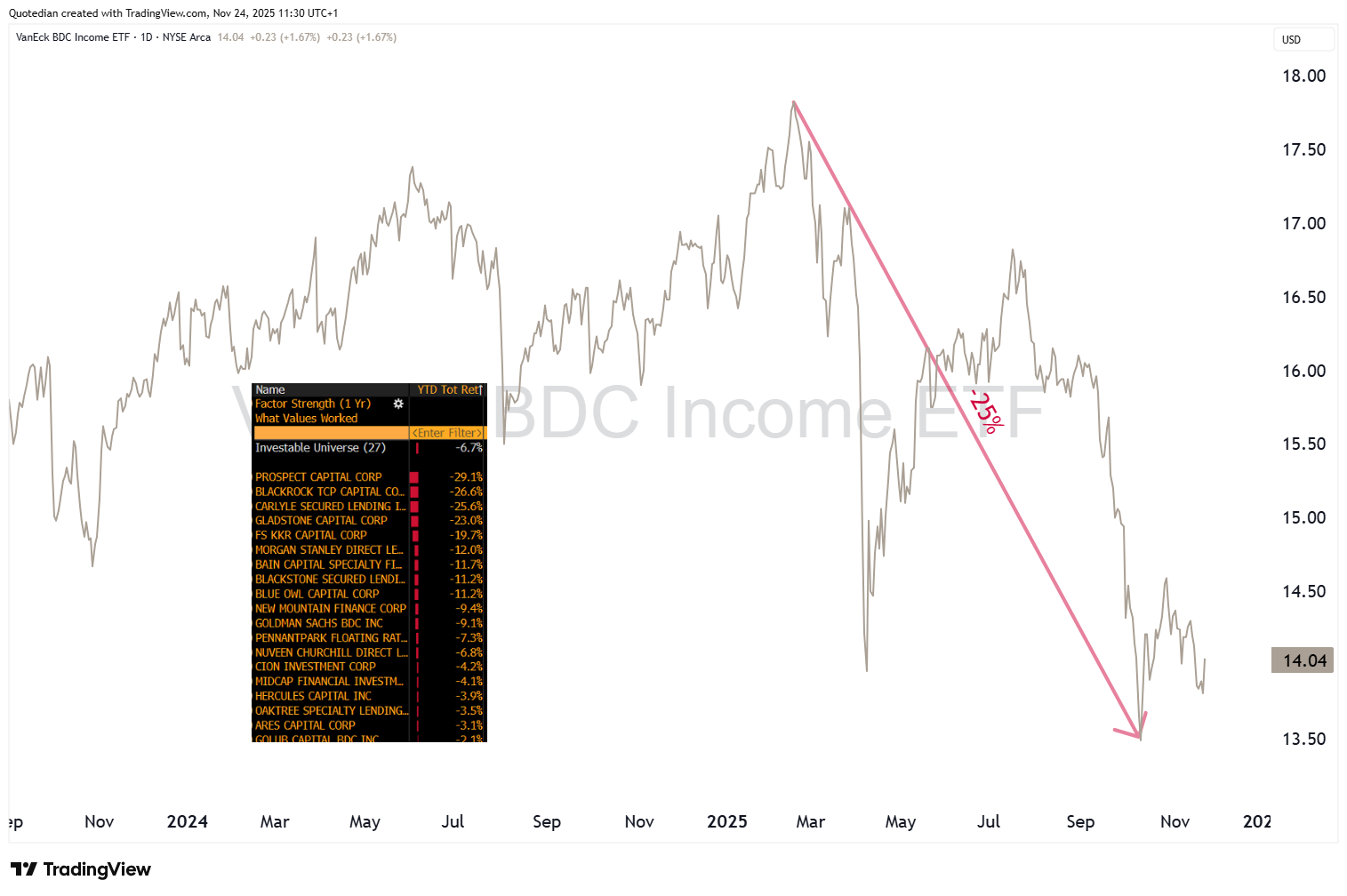 But even though no specific stress is visible in the Financial sectors CDSs (yet), the private credit/debt part continues to fall apart as for example witnessed by the VanEck BDC (Business Development Company) Income ETF and its components: