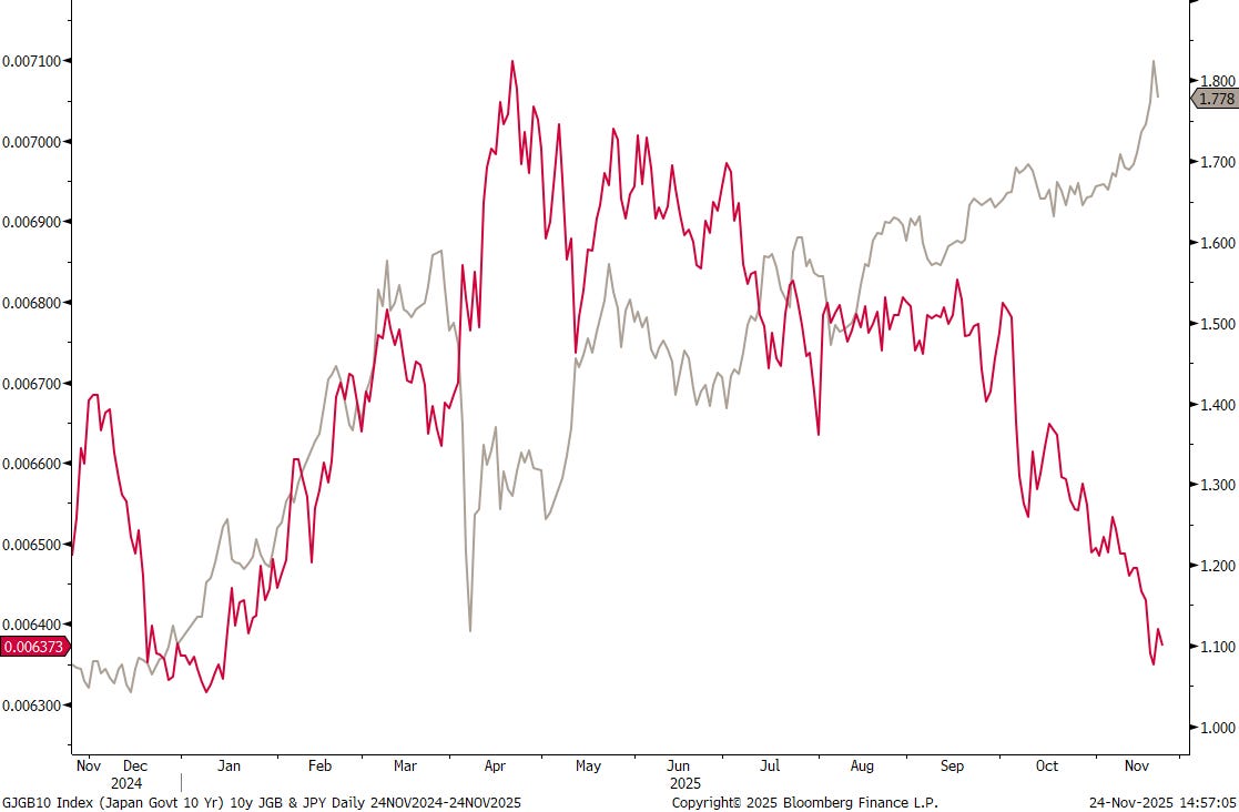 This study of Japanese yields serves as perfect segue into the currency section, where we observe that despite the rising 10-year JGB yield (grey), and a shrinking US-Japan yield spread (not shown), the Japanese yen is weakening versus the US Dollar (red line):