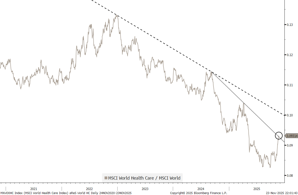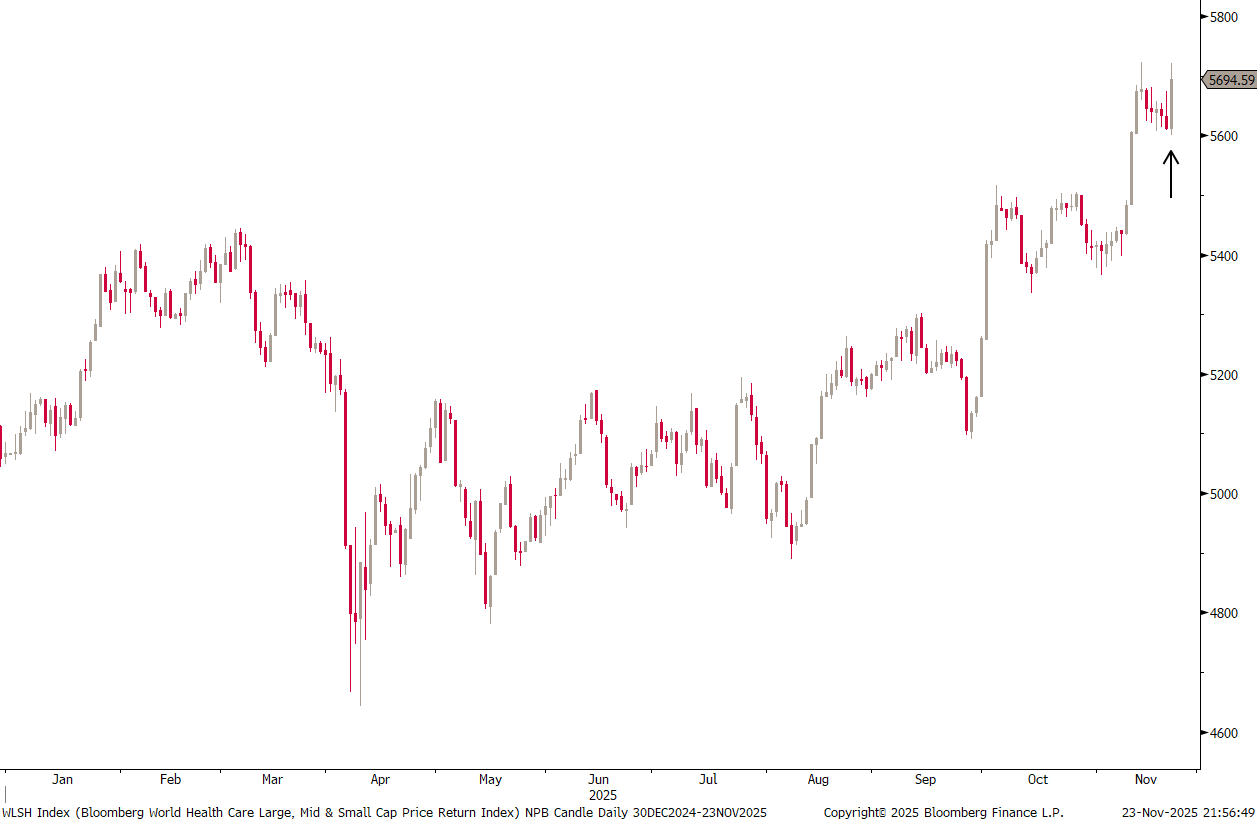 As I had shown in other instances, the health care relative bull could be only in its earliest innings. Here is the Bloomberg Word Health Care Large, Mid and Small cap index, showing a very nice positive reversal candle on Friday: