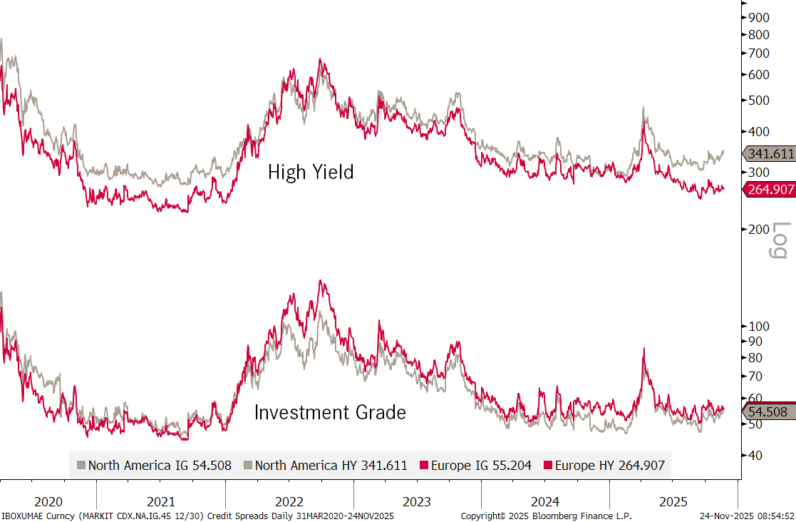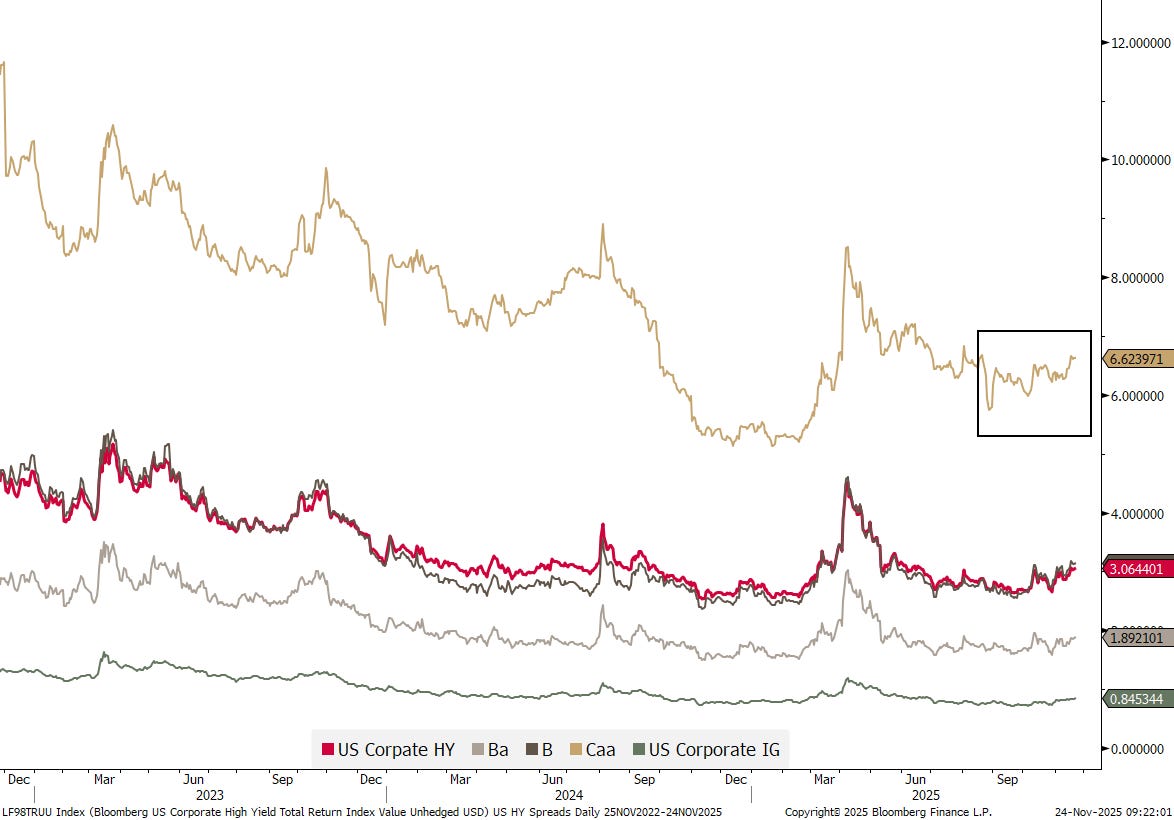 A possible divergence is noted between US and European high yield, which mostly stems from a widening in the lowest grade part of US high yield (brown line):