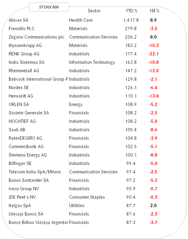 Now, let’s finish off the equity section via our usual glance at the best performing stocks in the US (S&P 500) and Europe (STOXX 600).