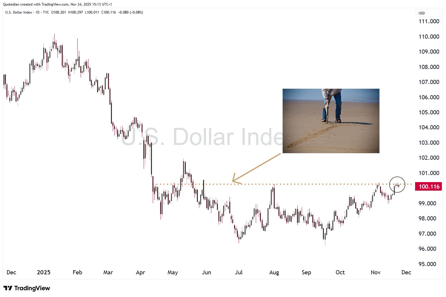 This means the US Dollar Index (DXY) is standing right AT your line in the sand: