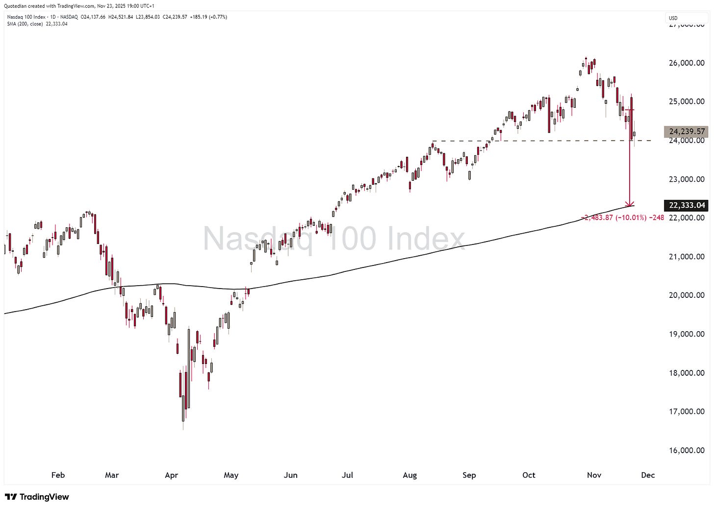Similarly, the Nasdaq-100, which has been weaker than the S&P 500, is at a “make-or-break” level and a “break” could take the index down another 10%: