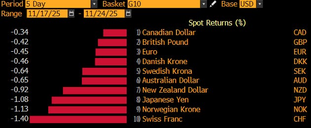 Anyway, the US Dollar has not been strongly only versus the JPY, but versus all other G10 currencies too over the past week: