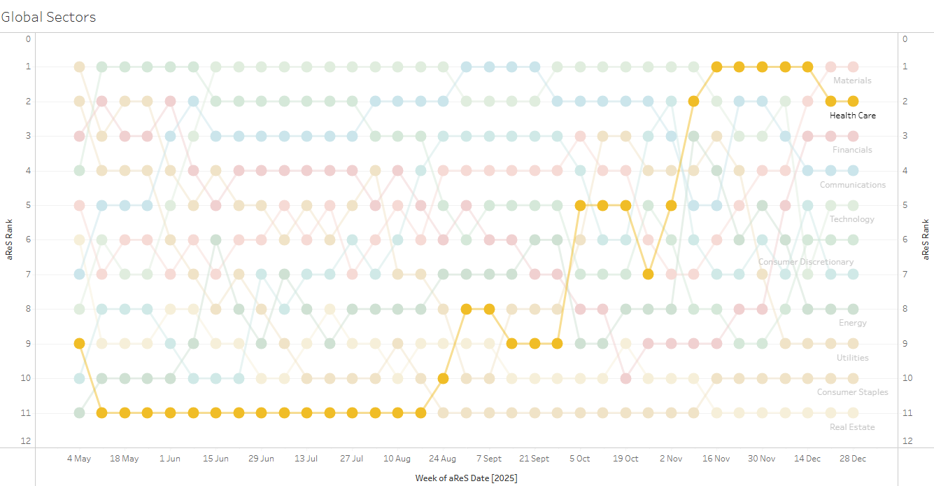 What you cannot see from the table above, but what I will show you with the graph below, is the comet-like ascent of health care stocks after having been bottom performer during weeks on end: