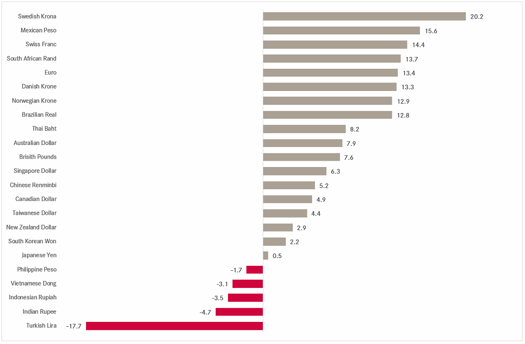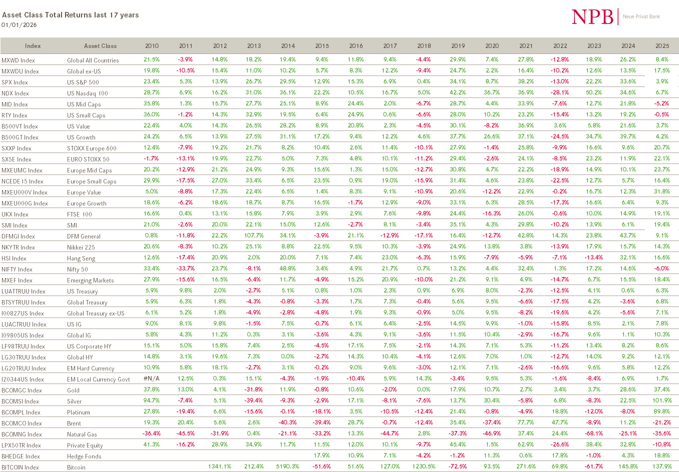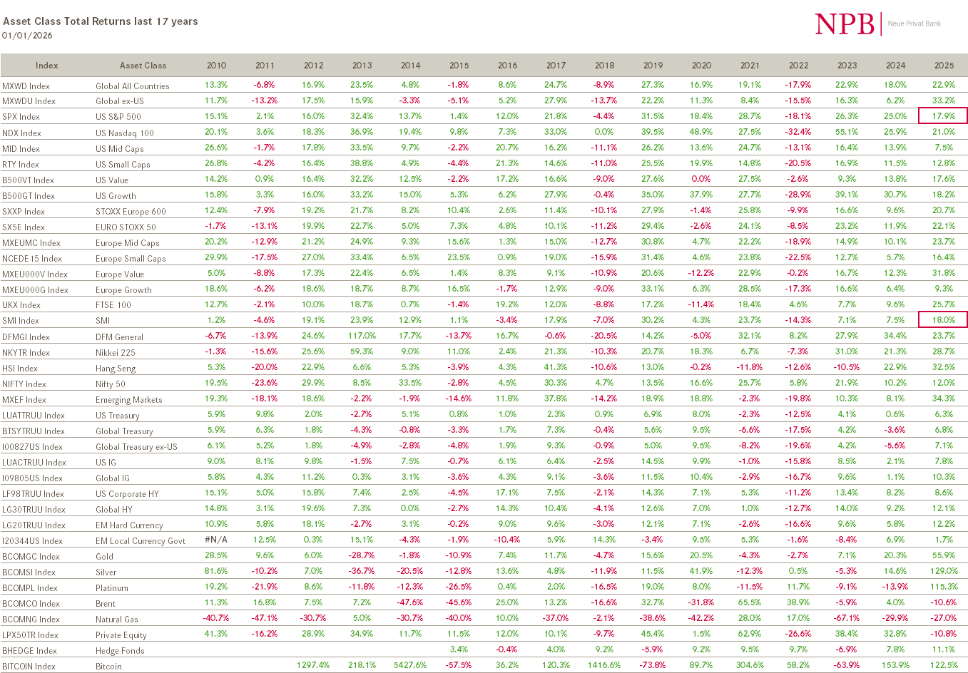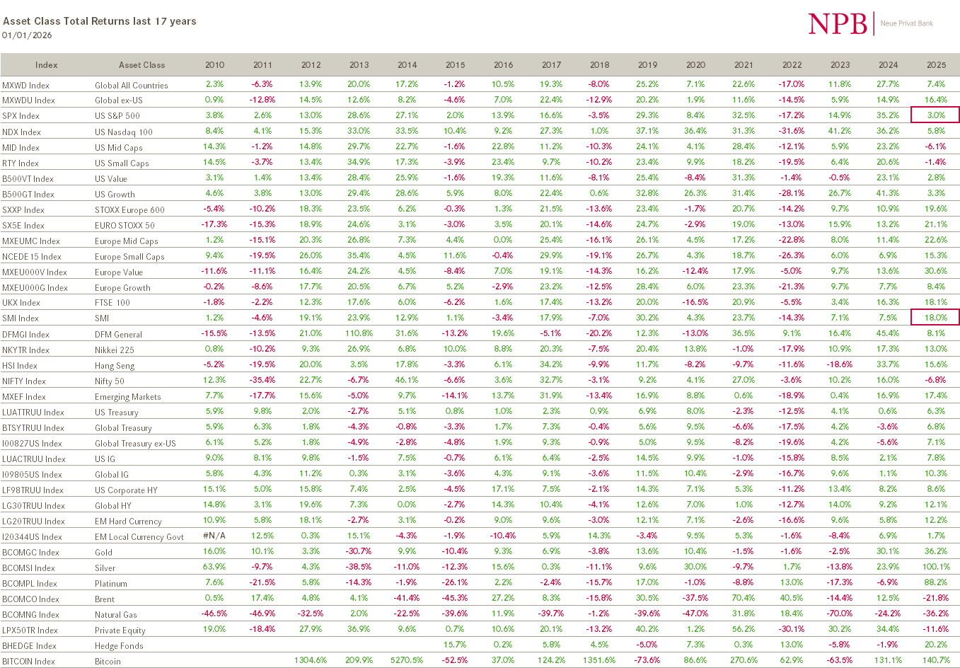 What clearly played a role in 2025 was your (foreign) currency exposure. For example, a Swiss (Franc)-based investor may think that the returns for the S&P 500 and his/her domestic equity index (SMI) are nearly identical at 18%: