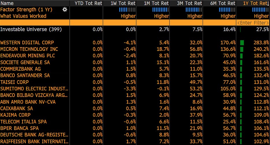 Ok, makes sense then with quite a few European Banks amongst those top performers, even though two tech stocks (WDC & MU) also sneaked into that value tracker.