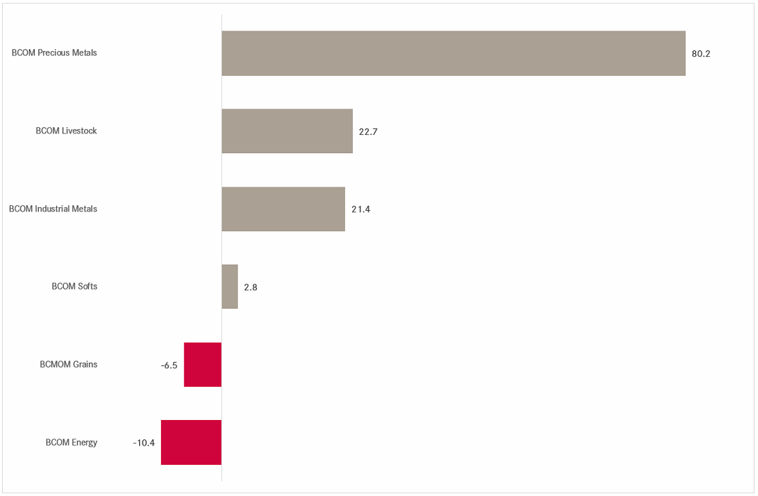 Precious metals up 80%, energy down 10% for a 90%-plus performance difference!