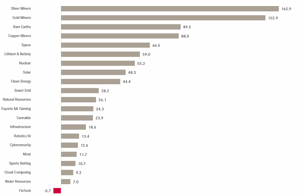 Let’s finish the equity section with a look at some thematic ETF performances in 2025: