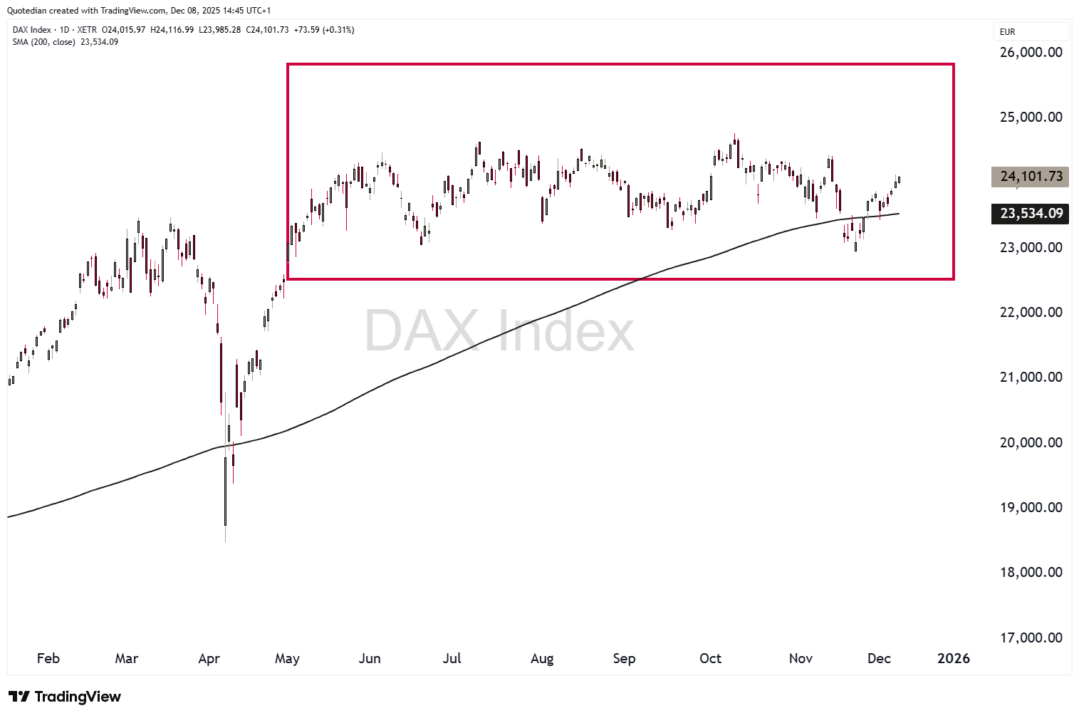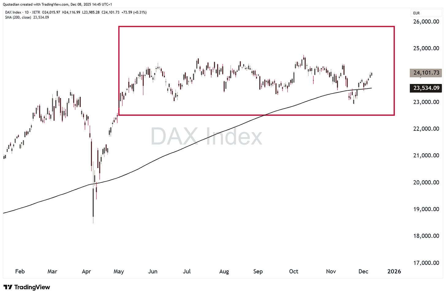 In Europe, Germany’s Dax continues to be range-bound, though the recent advances have lifted the index above its 200-day moving average again: