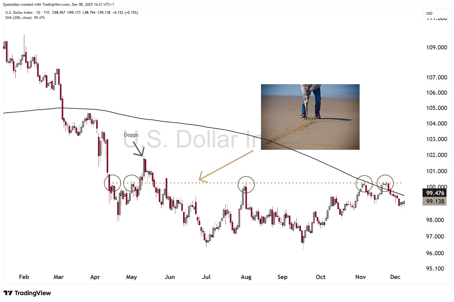 The US Dollar Index itself continues to trade below our line in the sand we drew at 100.00 and seems to have additional headwind from the falling 200-day moving average: