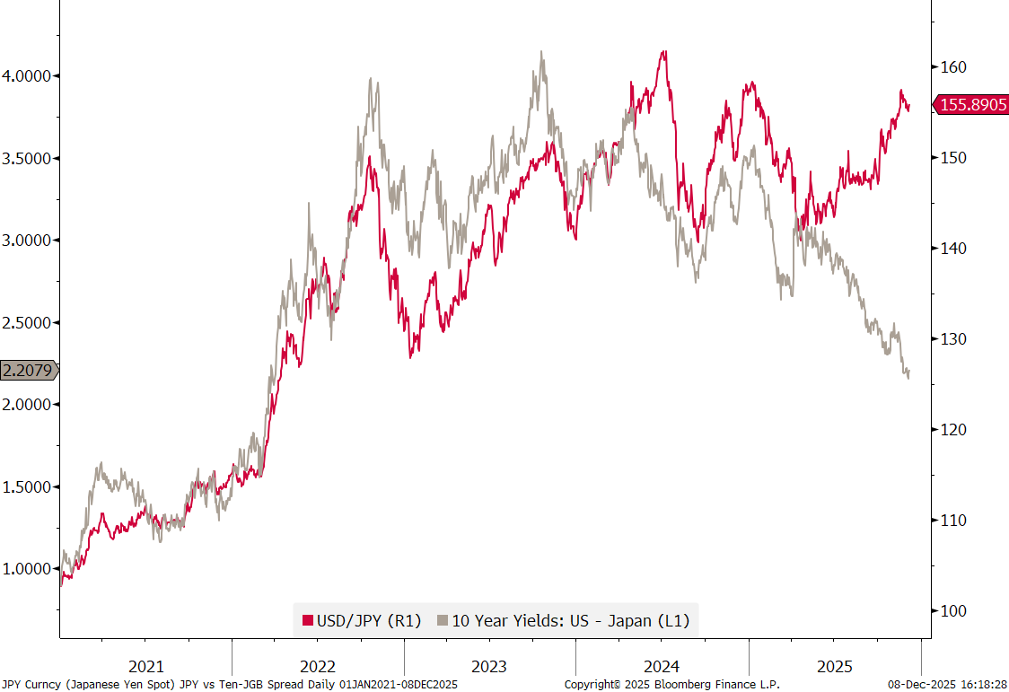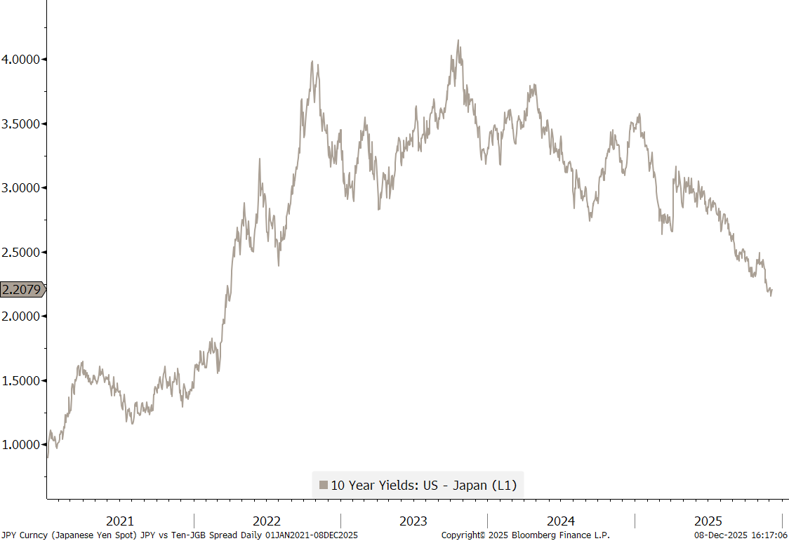 So, we have the Fed who will cut rates this week and the Bank of Japan likely with hiking its policy rate next wee. Hence the interest rate differential between the US and Japanese bonds (grey line) should be shrinking, right?