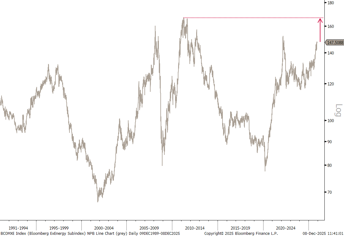If we exclude the energy component from the index, which is around 30% between crude oil, natural gas, heating oil, diesel, etc., the chart looks even better, with prices closing in on the 2010 highs: