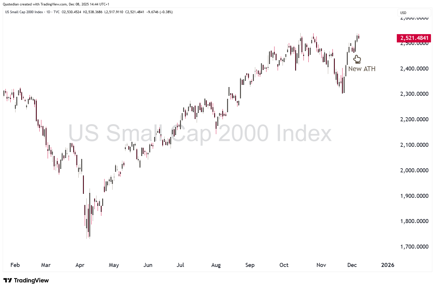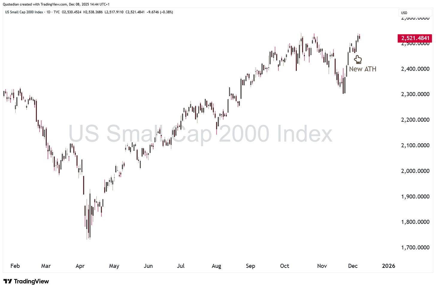 One index that HAS already reached a new all-time high is the small cap focused Russell 2000: