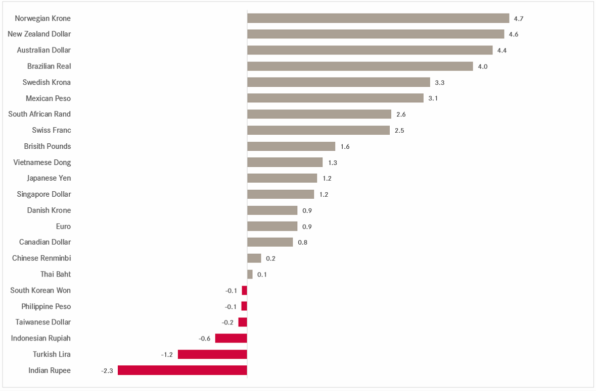 In currency markets, here’s the performance of a selection of global currencies versus the US Dollar: