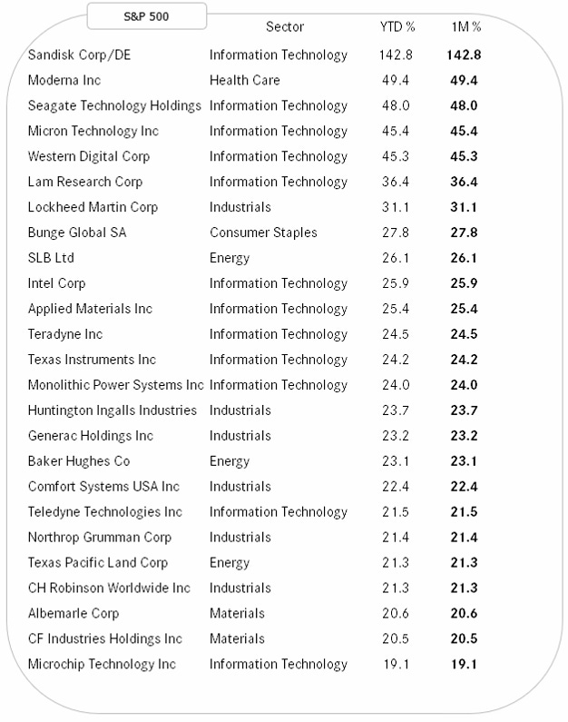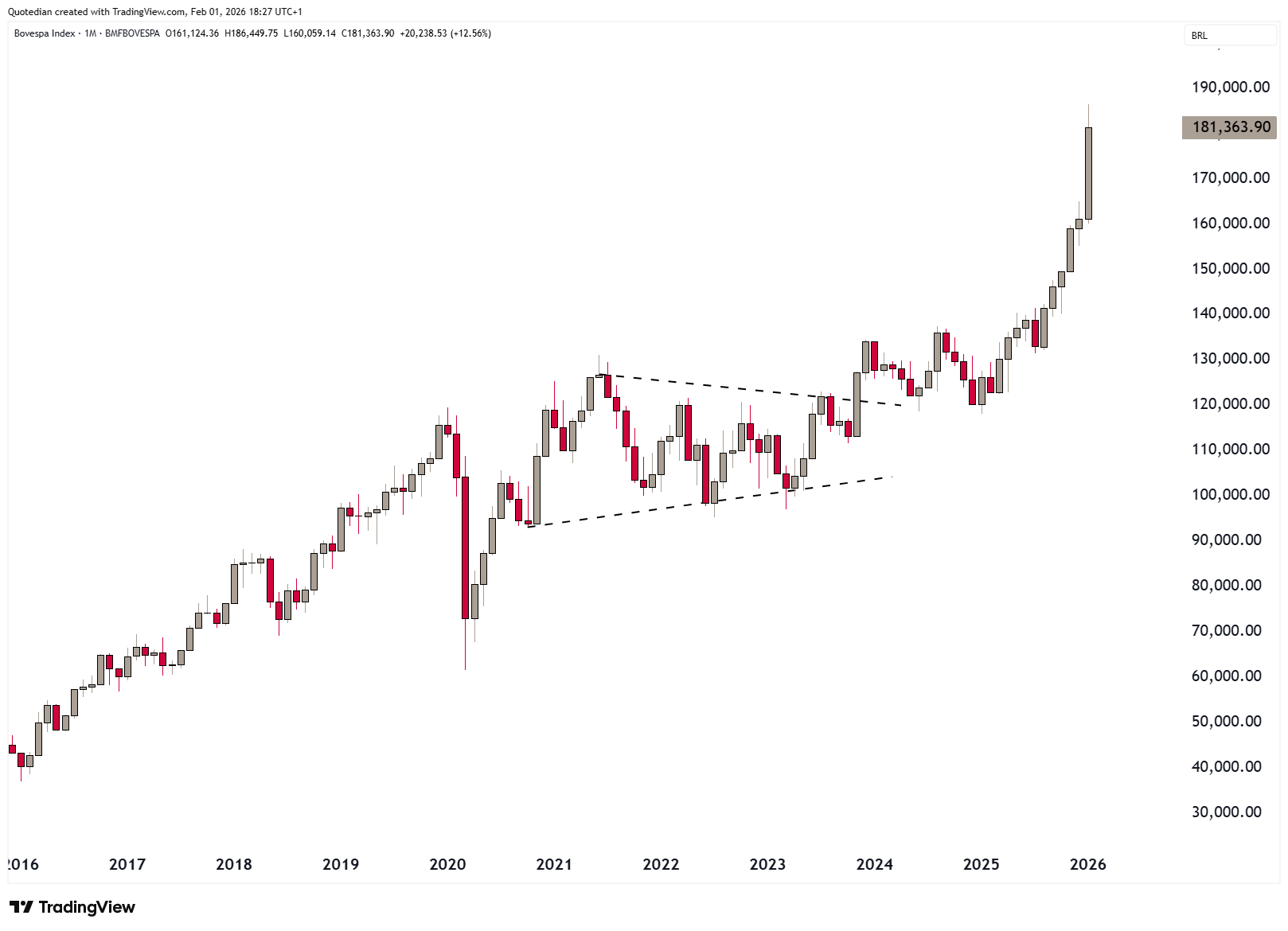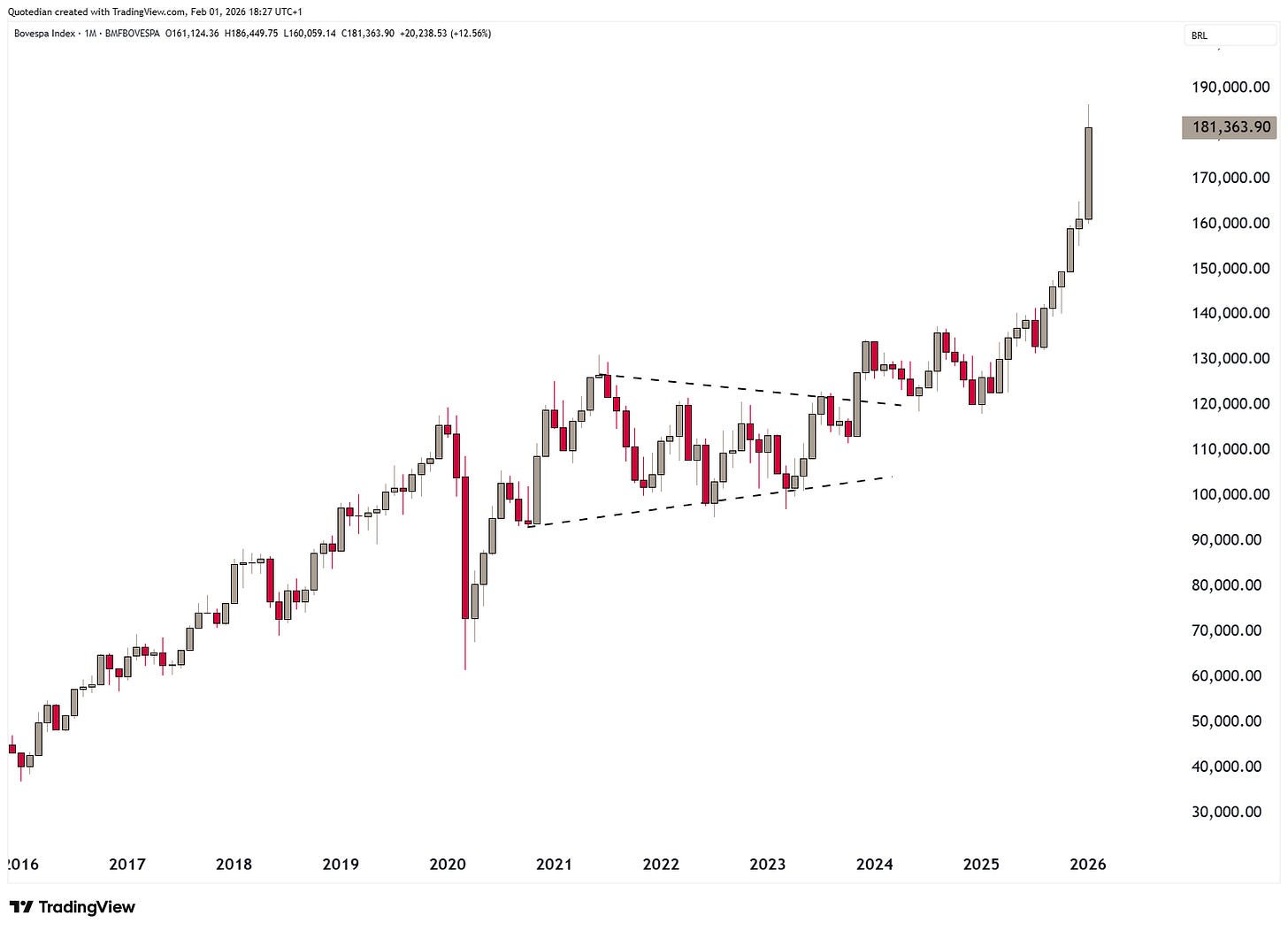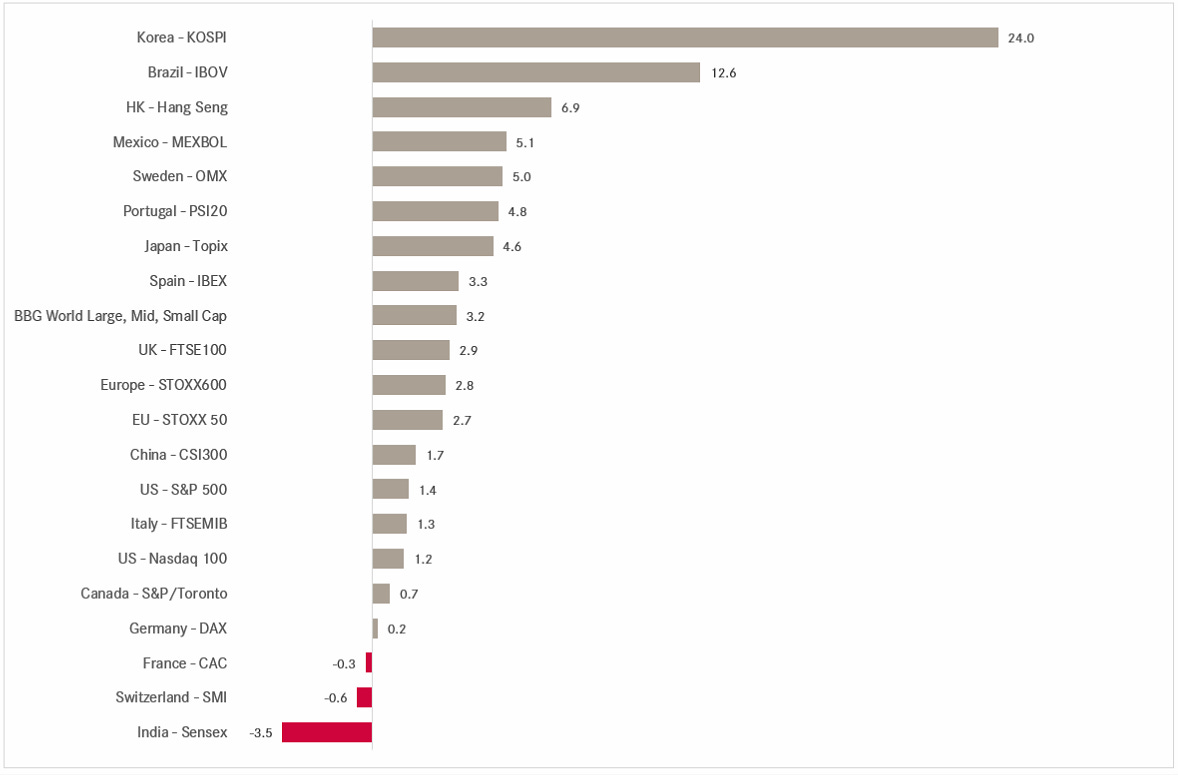 The KOSPI in South Korea and the IBOVESPA in Brazil stand out as the largest gainers. The first is moved big time by index heavy-weights Samsung Electronics and SK Hynik, which are up 34% and 40% respectively on the back of their memory business.