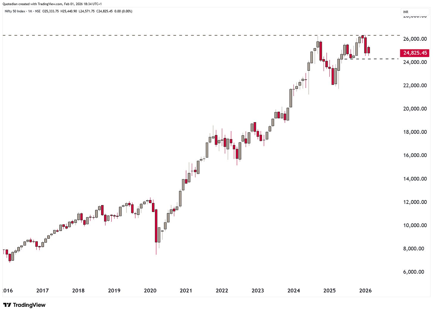 The monthly chart shows it’s been a tough year and a half for Indian equity investors, at 24,000 on the BSE must hold to not worsen matters: