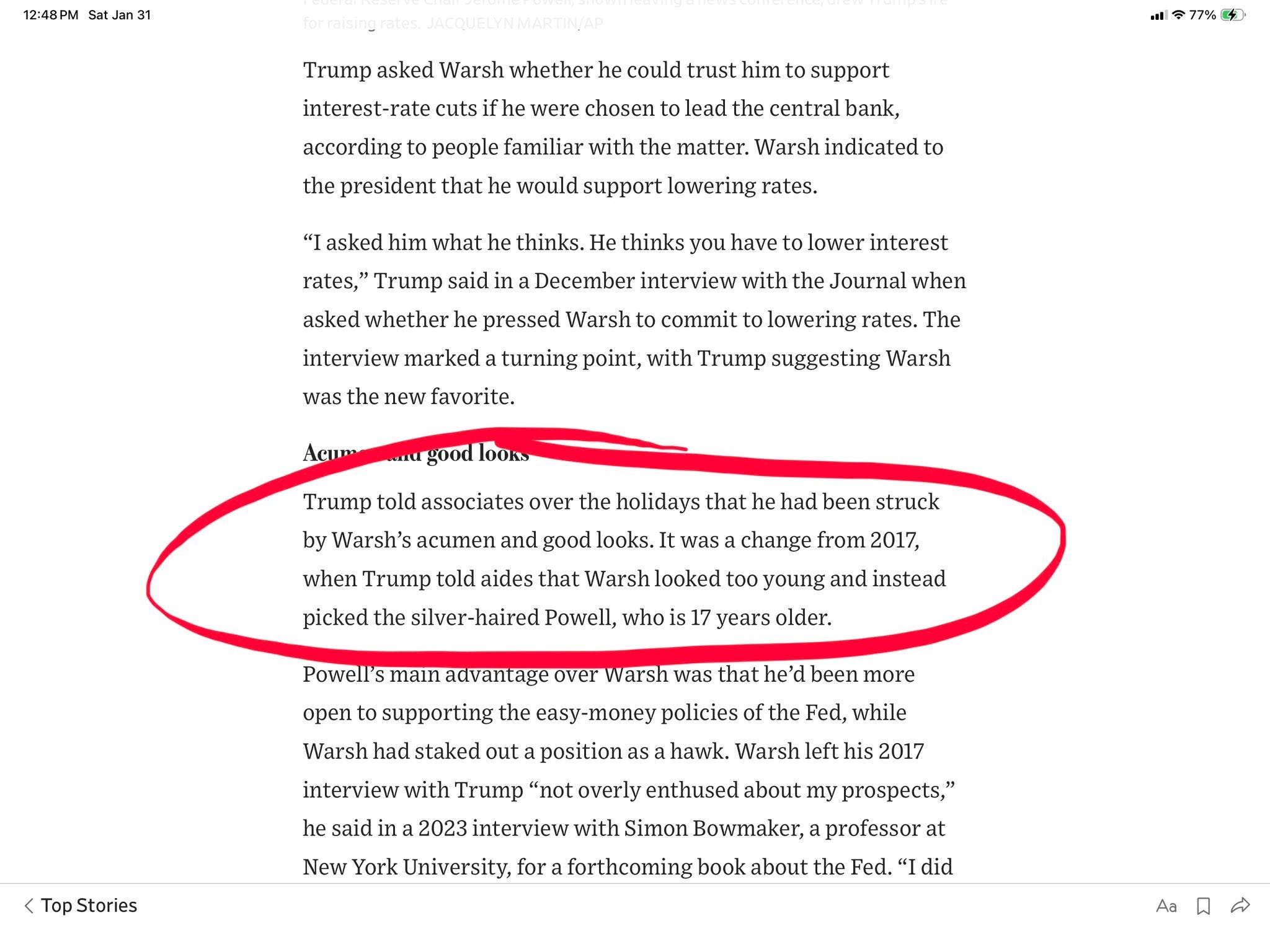 One of the key themes has of course been the nomination of the new Fed chair to be, which was resolved last Friday. Enter Mr. Warsh, which apparently was chosen not least for his good looks: