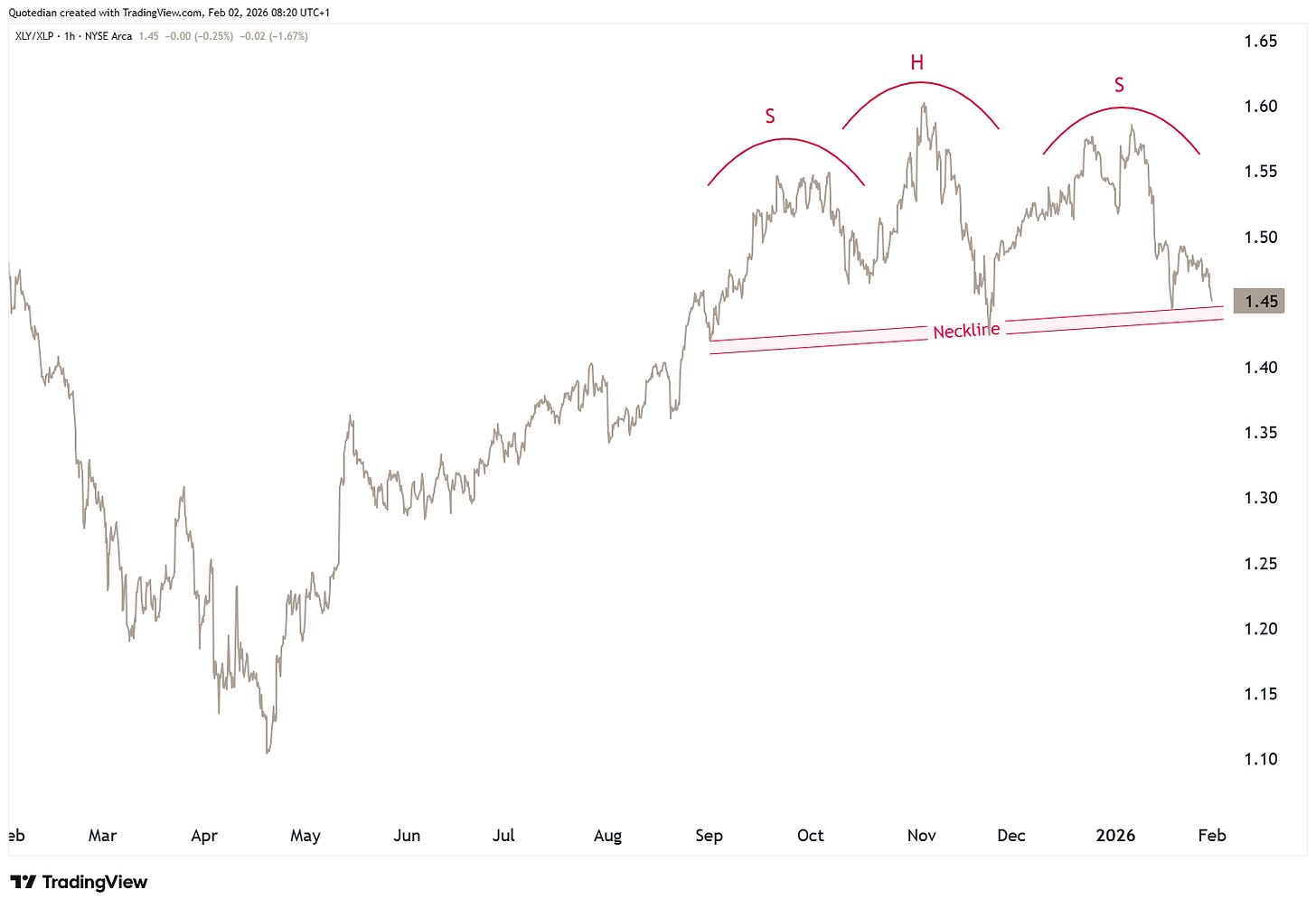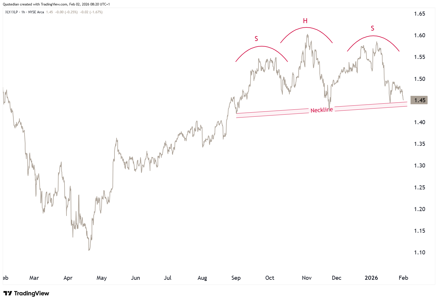 Take the ratio of ETFs on US discretionary (XLY) and staple (XLP) stocks as a proxy, we see a possible shoulder-head-shoulder reversal pattern unfolding: