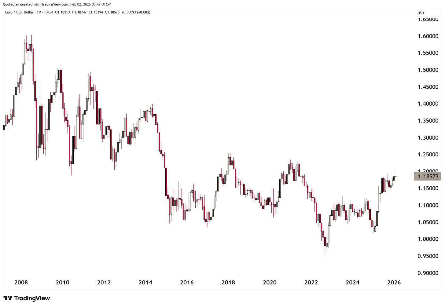 To me, it seems that the path of least resistance on the monthly NotEUR/USD chart is upwards: