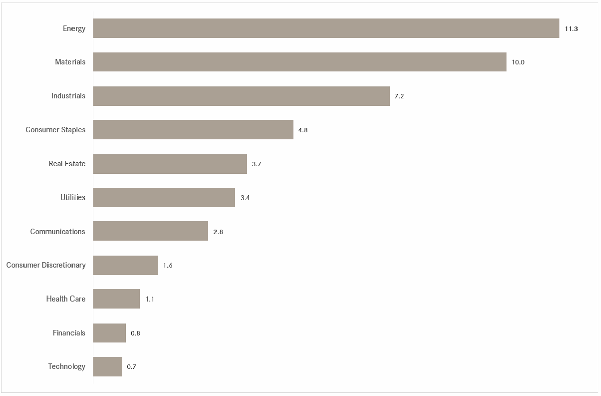 January’s rally has been lead by ‘commodity-related’ sectors such as materials and energy, but what we want to focus on here are consumer staples outperforming consumer discretionary stocks by a wide margin.