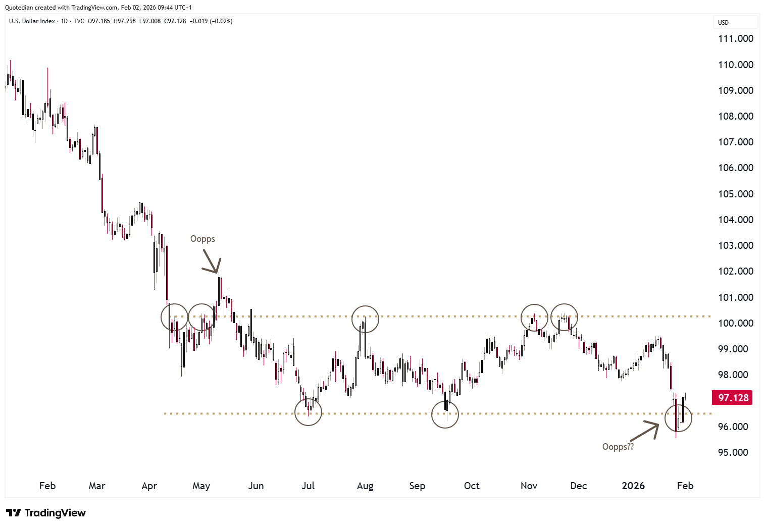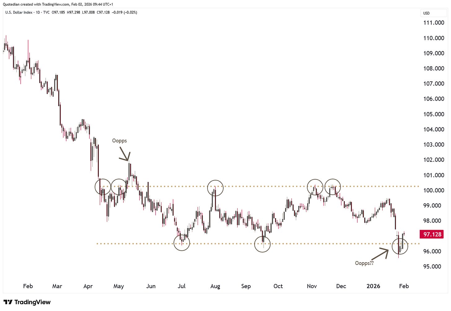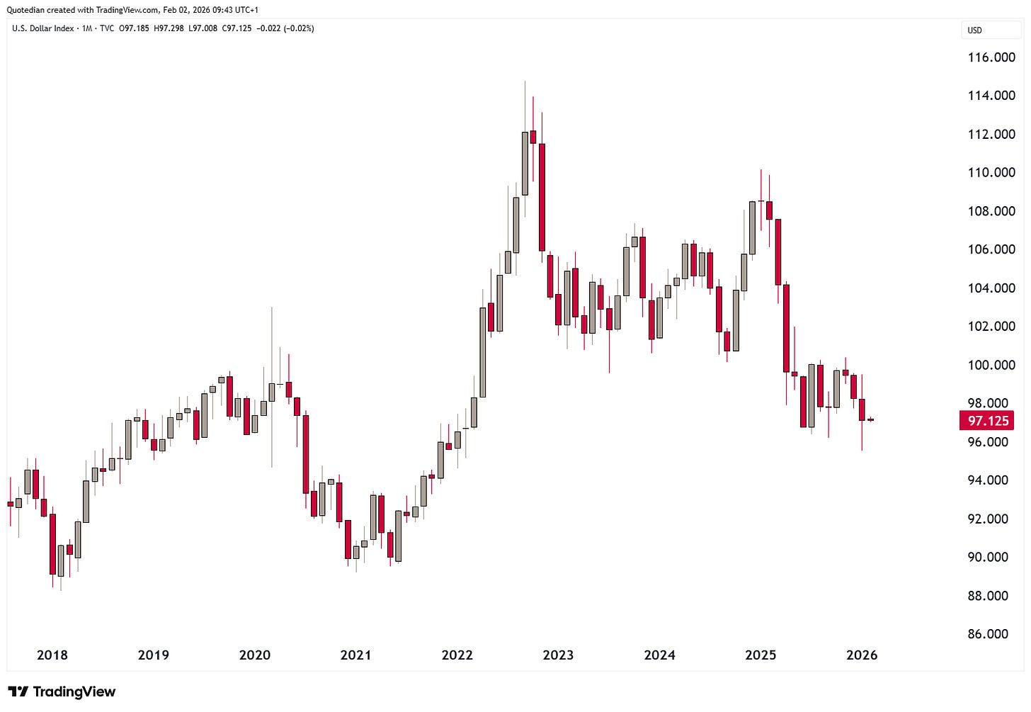 Here’s the very unexciting monthly chart of the US Dollar Index (DXY):