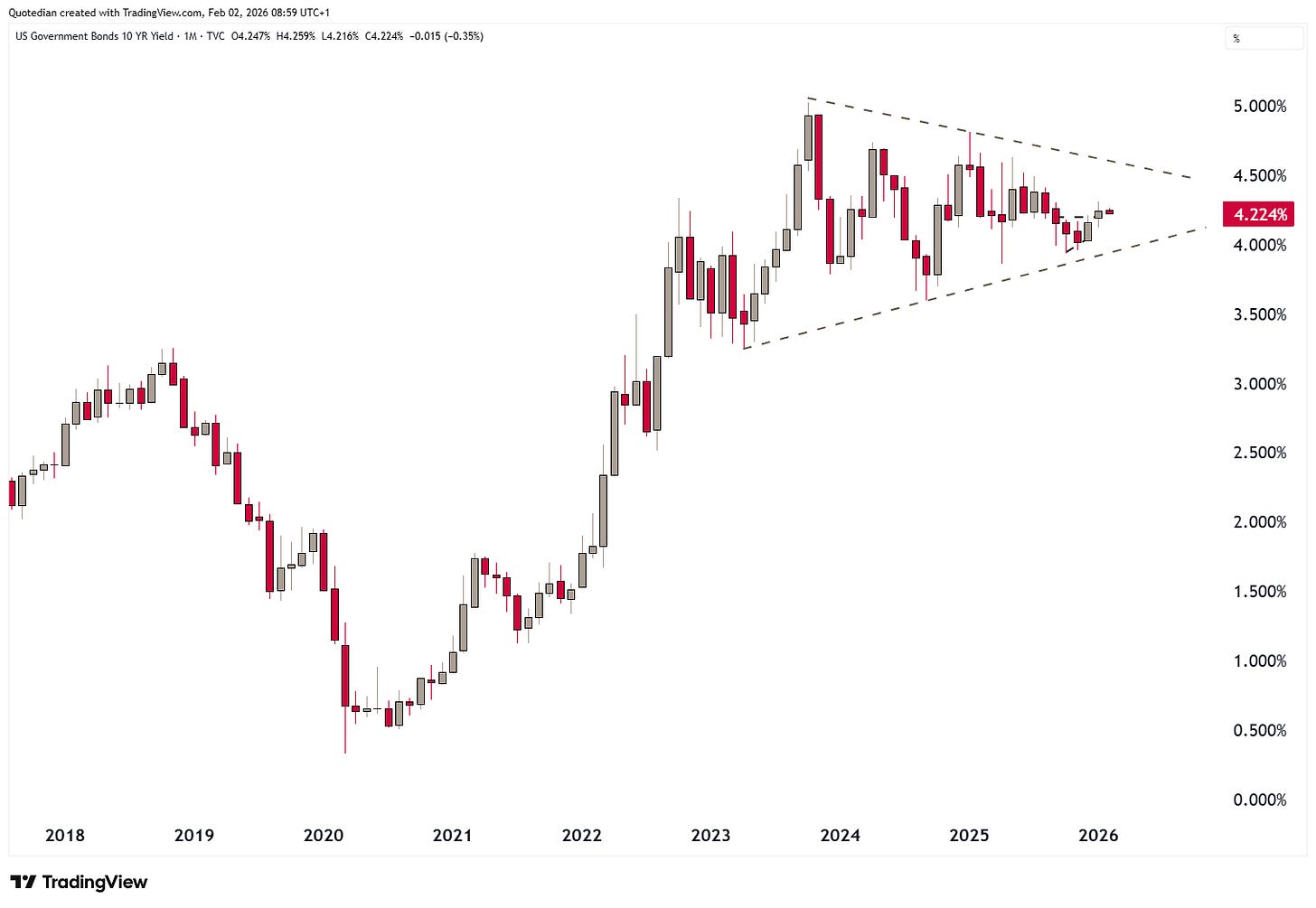 On the monthly chart of the US 10-year Treasury yield chart we are still patiently waiting for a resolution out of the triangle, likely not due before Q2/2026: