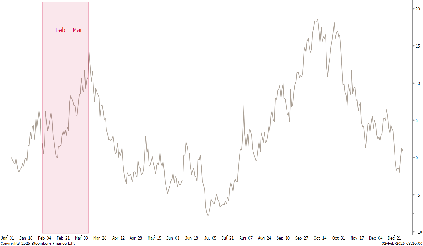 Seasonally, the “easy” mid-October to early February period is coming to an end, and given this morning’s weakness we may indeed have found an early stop to the what seemed a tired uptrend anyway: