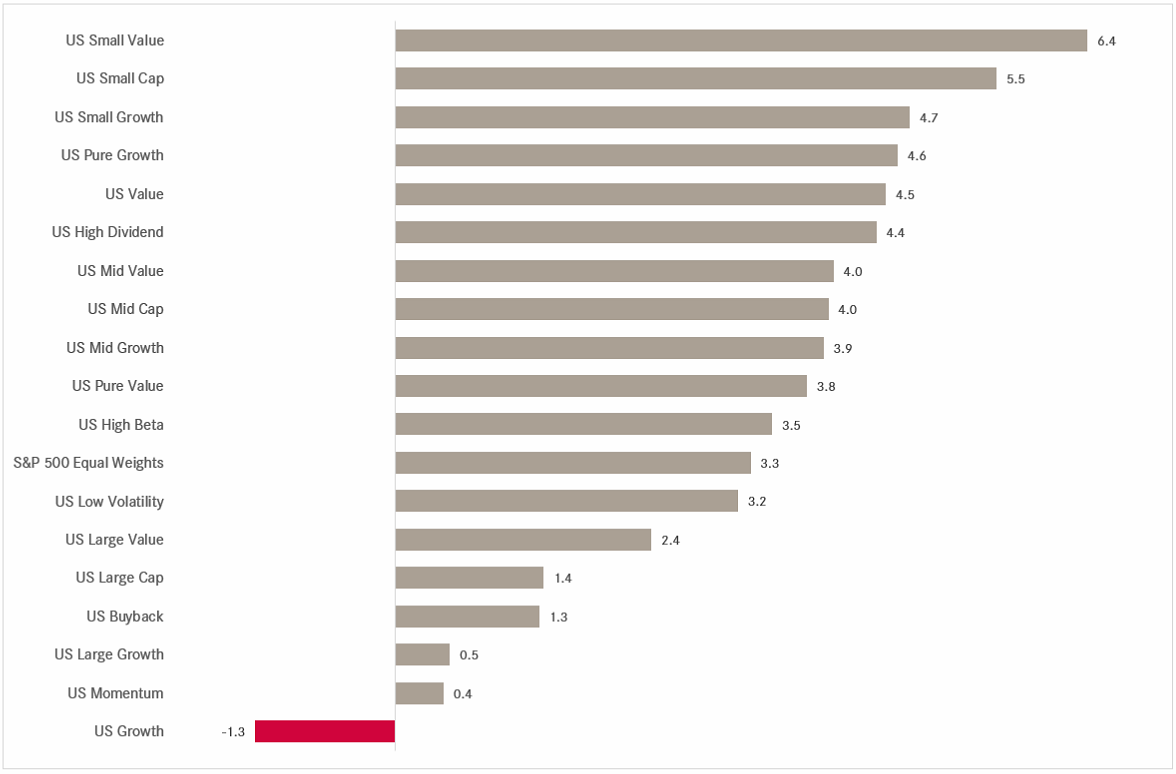 Not unrelated, the factor performance table also suddenly shows value factors much more at the upper end of the performance gamma and US growth as a clear underperformer: