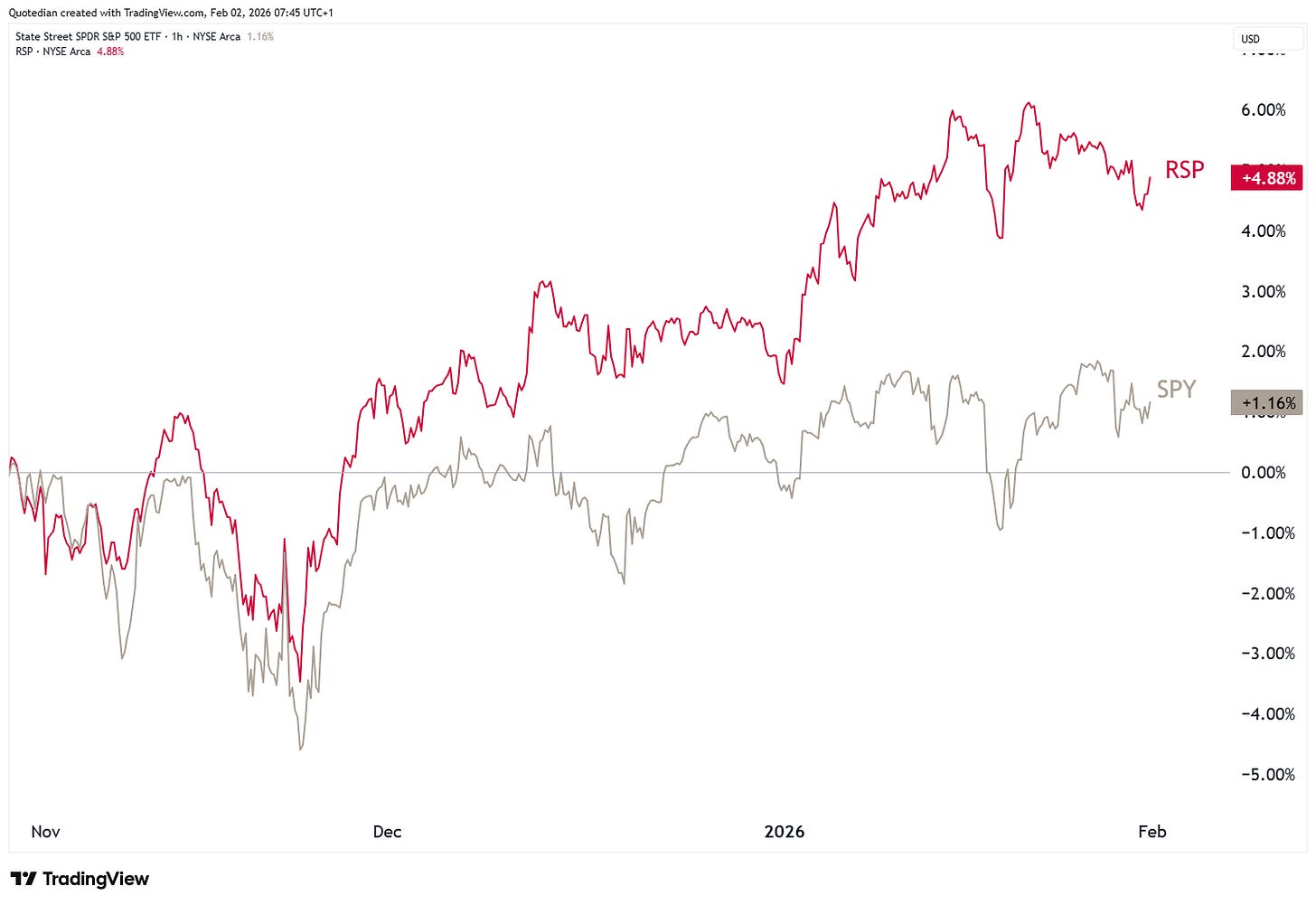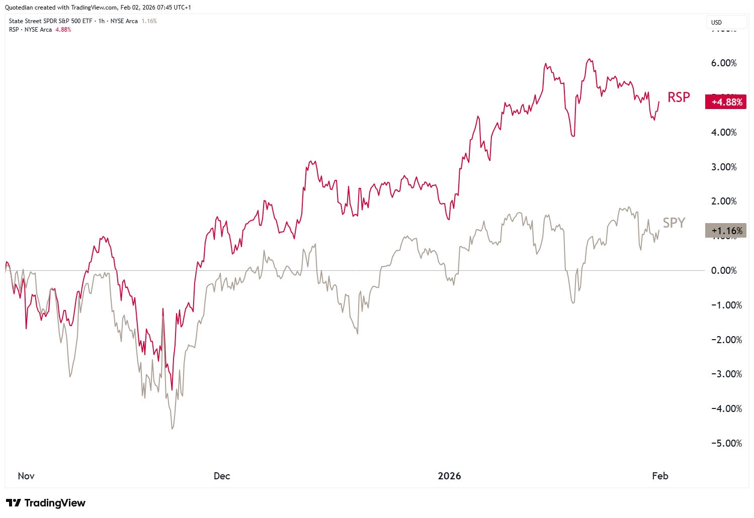 Accordingly, the equal-weight version (RSP) of the S&P 500 has been doing better than the ‘normal’ cap-weighted (SPY) version: