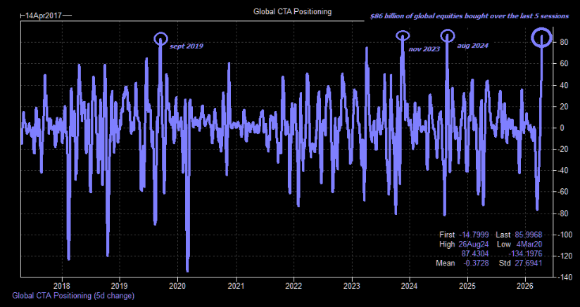 Clearly, a short squeeze has taken place, with CTA’s (trend followers) buying $86bn of global equities according to Goldman Sachs (GS), top 5 all-time!