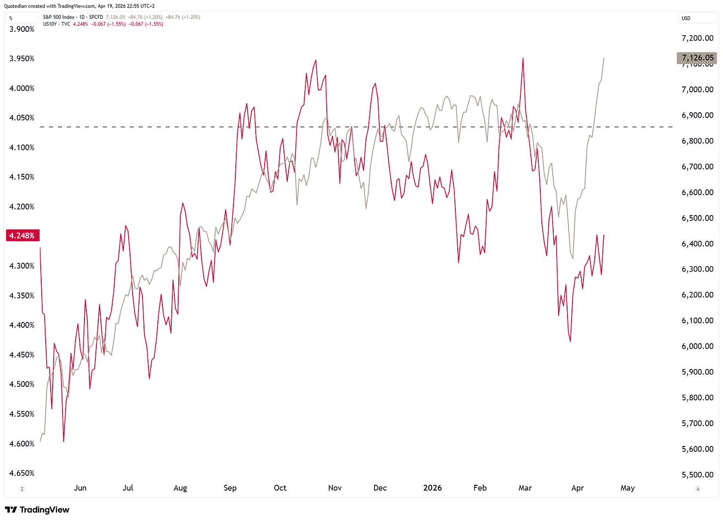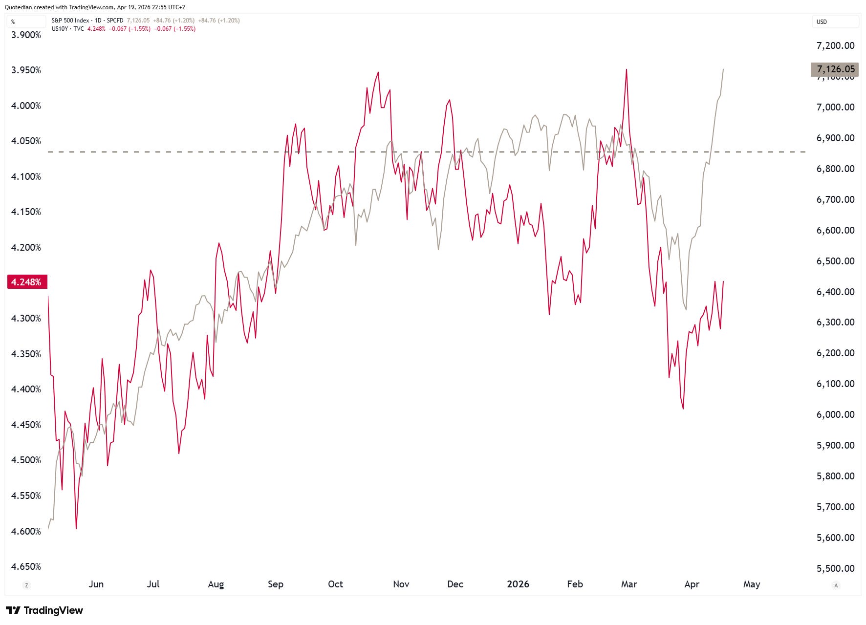 The following chart illustrates that disconnect between US10YT yields (red, inverted) to the S&P 500 (grey):