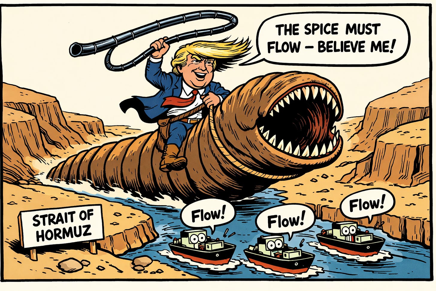 Now squint a little. Replace Arrakis with the Persian Gulf, melange with crude and LNG, and the Spacing Guild’s monopoly with a 21-mile-wide strait flanked by a bruised and bothered Iran — and welcome to 2026. Roughly a fifth of the world’s oil and a quarter of seaborne LNG squeeze through the Strait of Hormuz every single day. Close it, choke it, or merely threaten it, and the cascade is brutal: energy → nitrogen fertilizer (no natural gas, no Haber-Bosch) → food. As we’ve been banging the drum in these pages: you can’t print molecules. And you certainly can’t reroute them around a closed chokepoint with a press release.