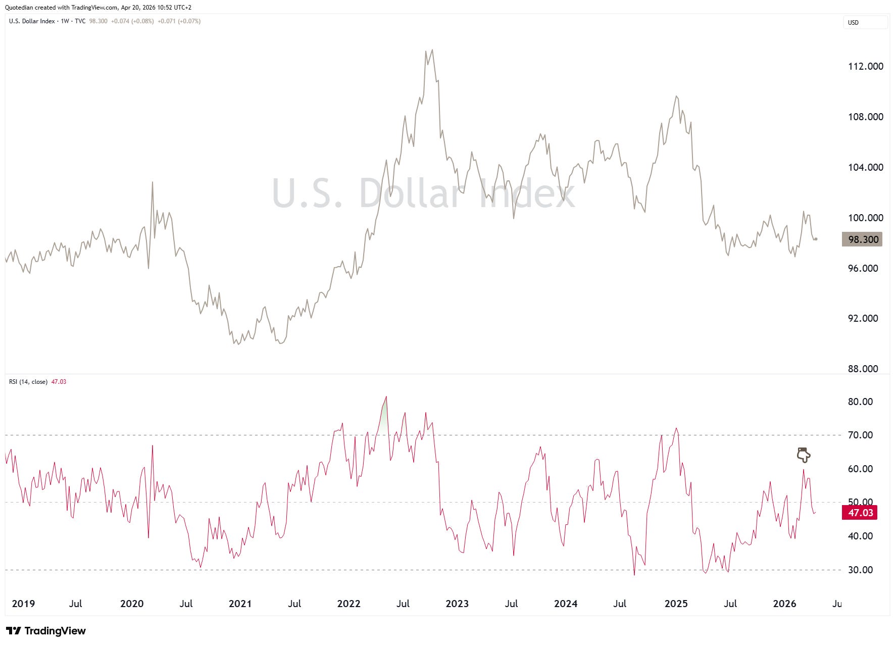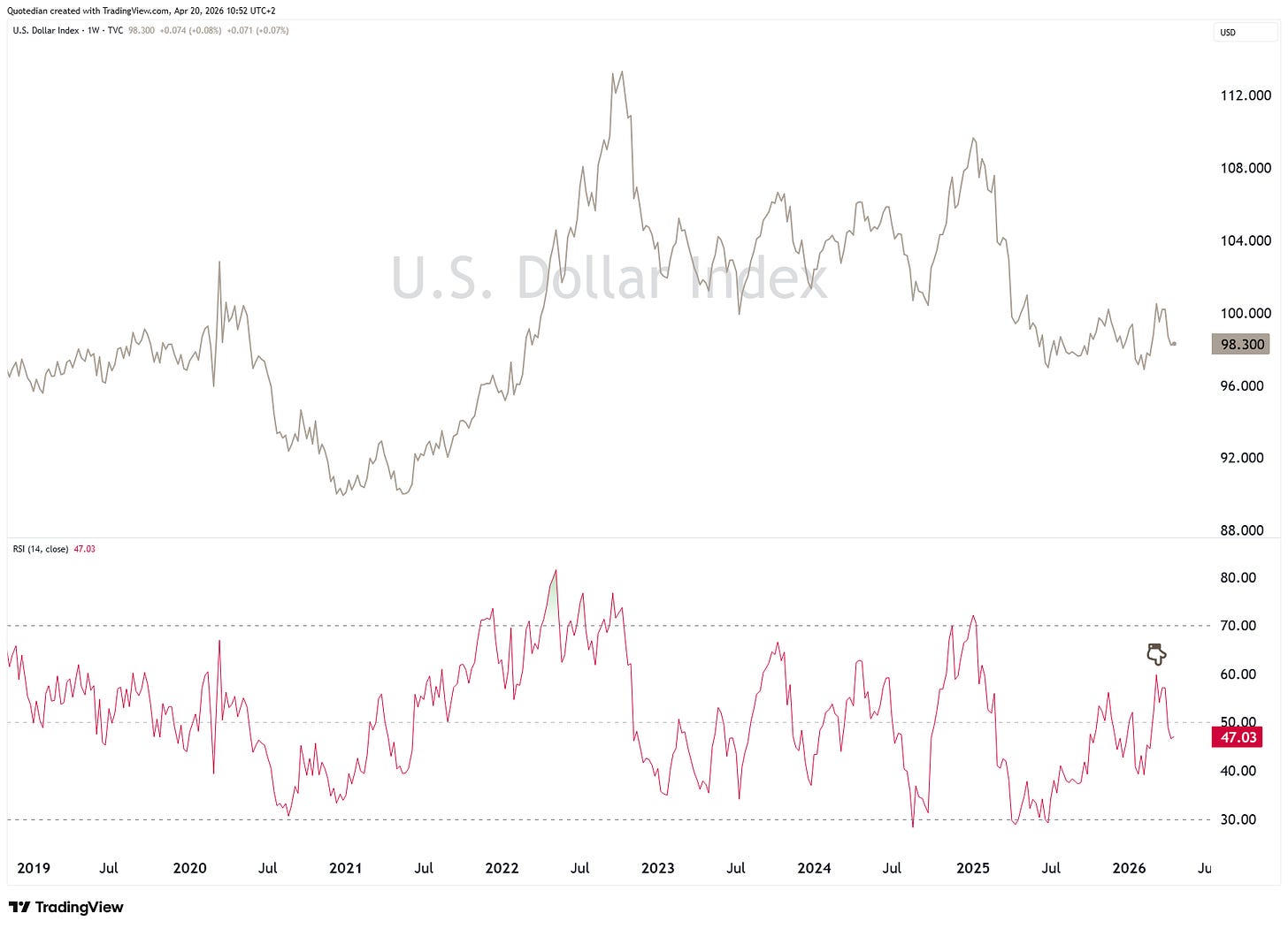 and it is noteworthy that during the last USD-rally the RSI was unable to rise above 60, which can be interpreted as a sign of underlying weakness:
