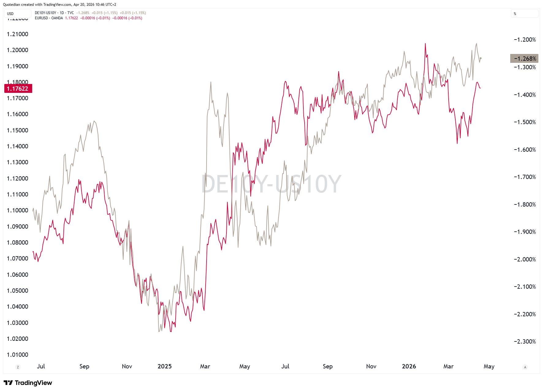 Which means the interest rate differential between European and US yields (grey line) is rising, increasing upside pressure on the EUR/USD cross (red line):