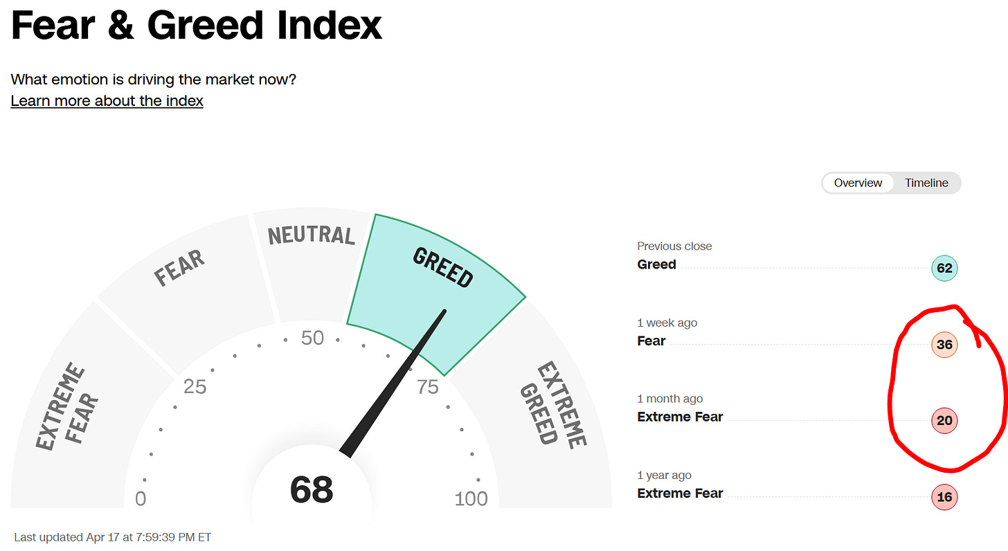 Similarly, CNN’s Greed and Fear indicator moved from Extreme Fear/Fear to Greed in a record short time: