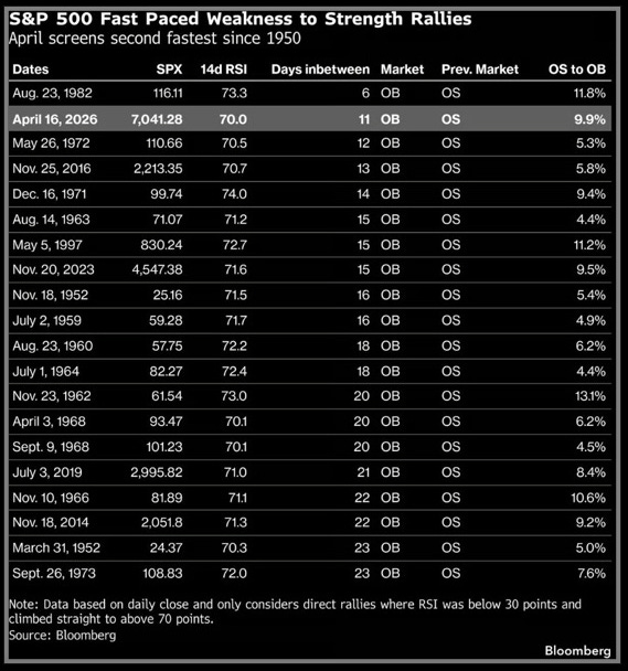 As a matter of fact, according to the following table from Bloomberg, this was the second fastest recovery (from RSI <30 oversold to RSI >70 overbought) since 1950: