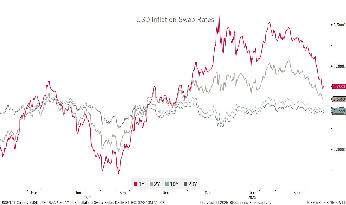 Contrary to the pick-up in yields related to “balance sheet” worries at the treasury described above, inflation expectations have actually been falling noticeably since late summer: