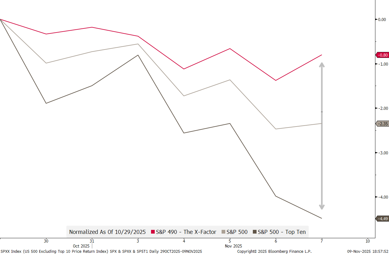 Hence, again, if you think the next few weeks could be a bit bumpy, but not outright bearish, which by sheer coincidence is also our view, it may be time to shun those gargantuan top 10 stocks and reach for the X-Factor (S&P 490)…
